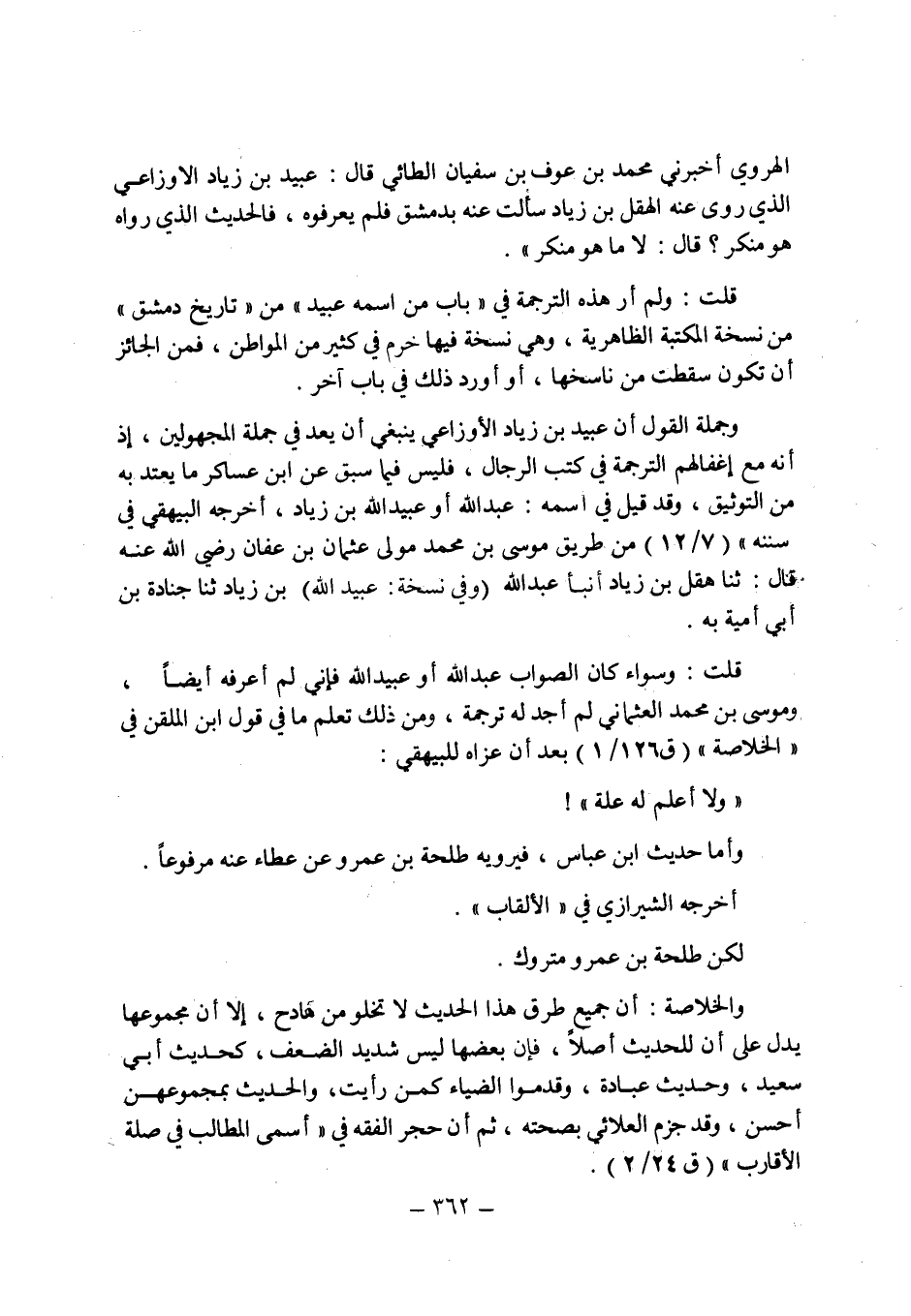قلت: وسواء كان الصواب عبد الله أو عبيد الله فإنى لم أعرفه أيضا , وموسى ابن محمد العثمانى لم أجد له ترجمة , ومن ذلك تعلم ما فى قول ابن الملقن فى " الخلاصة " (ق 126/1) بعد أن عزاه للبيهقى: " ولا أعلم له علة "!