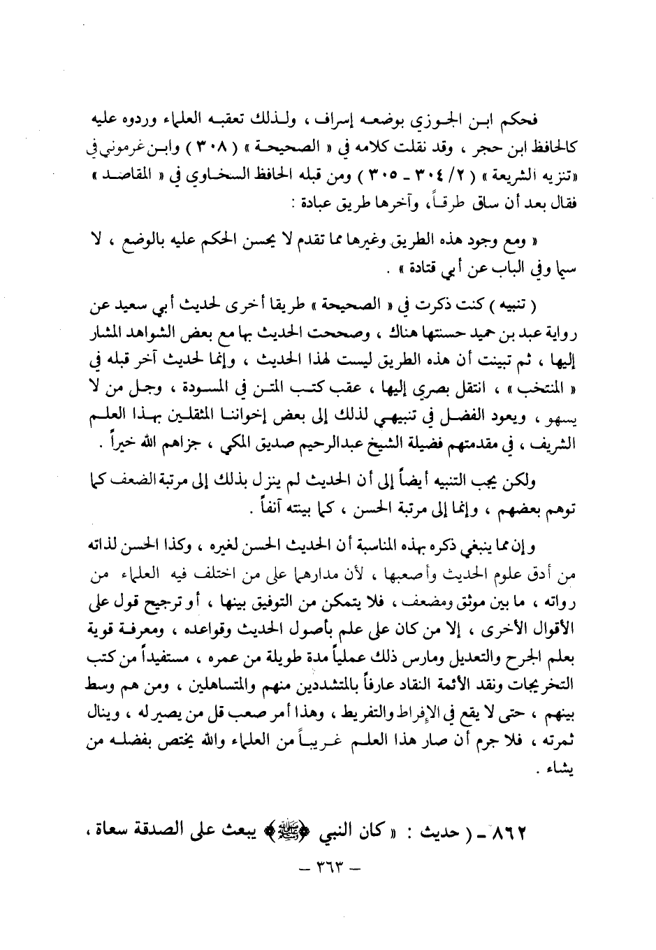 فحكم ابن الجوزى بوضعه إسراف , ولذلك تعقبه العلماء وردوه عليه كالحافظ ابن حجر , وقد نقلت كلامه فى " الصحيحة " (308) وابن غرموني [1] فى " تنزيه الشريعة " (2/304 ـ 305) ومن قبله الحافظ السخاوى فى " المقاصد " فقال بعد أن ساق طرقا , وآخرها طريق عبادة: " ومع وجود هذه الطريق وغيرها مما تقدم لا يحسن الحكم عليه بالوضع , لا سيما وفى الباب عن أبى قتادة ".