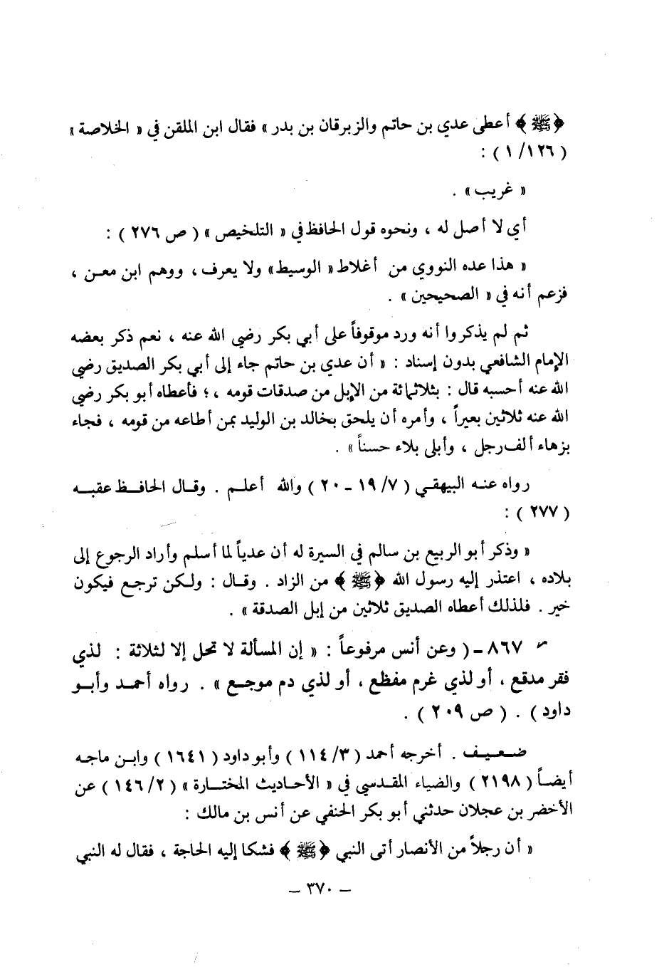 صلى الله عليه وسلم أعطى عدى بن حاتم والزبرقان بن بدر " فقال ابن الملقن فى "الخلاصة " (126/1) : " غريب ".