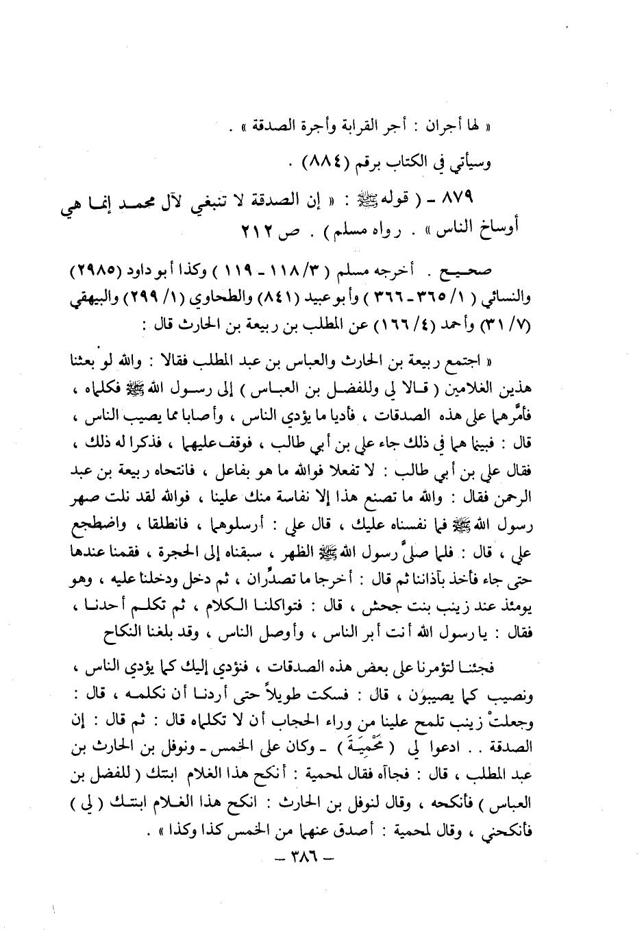 أخرجه مسلم (3/118 ـ 119) وكذا أبو داود (2985) والنسائى (1/365 ـ 366) وأبو عبيد (841) والطحاوى (1/299) والبيهقى (7/31) وأحمد (4/166) عن المطلب بن ربيعة بن الحارث قال: " اجتمع ربيعة بن الحارث والعباس بن عبد المطلب فقالا: والله لو بعثنا هذين الغلامين (قالا لى وللفضل بن العباس) إلى رسول الله صلى الله عليه وسلم فكلماه , فأمرهما على هذه الصدقات , فأديا ما يؤدى الناس , وأصابا مما يصيب الناس , قال: فبينما هما فى ذلك جاء على بن أبى طالب , فوقف عليهما , فذكرا له ذلك , فقال على بن أبى طالب: لا تفعلا فو الله ما هو بفاعل , فانتحاه ربيعة بن عبد الرحمن فقال: والله ما تصنع هذا إلا نفاسة منك علينا , فو الله لقد نلت صهر رسول الله صلى الله عليه وسلم فما نفسناه عليك , قال على: أرسلوهما , فانطلقا , واضطجع على , قال: فلما صلى رسول الله صلى الله عليه وسلم الظهر , سبقناه إلى الحجرة , فقمنا عندها حتى جاء فأخذ بآذاننا ثم قال: أخرجا ما