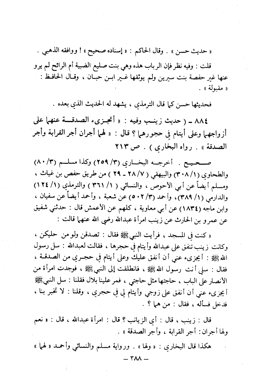 (884) - (حديث زينب وفيه: " أتجزىء الصدقة عنهما على أزواجهما وعلى أيتام فى حجورهما؟ قال: لهما أجران أجر القرابة وأجر الصدقة " رواه البخارى (ص 213) .