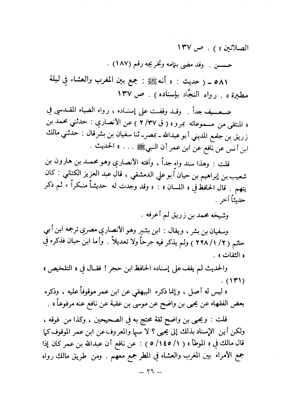 (581) - (حديث: " أنه صلى الله عليه وسلم جمع بين المغرب والعشاء فى ليلة مطيرة " رواه النجاد بإسناده (ص 137) .