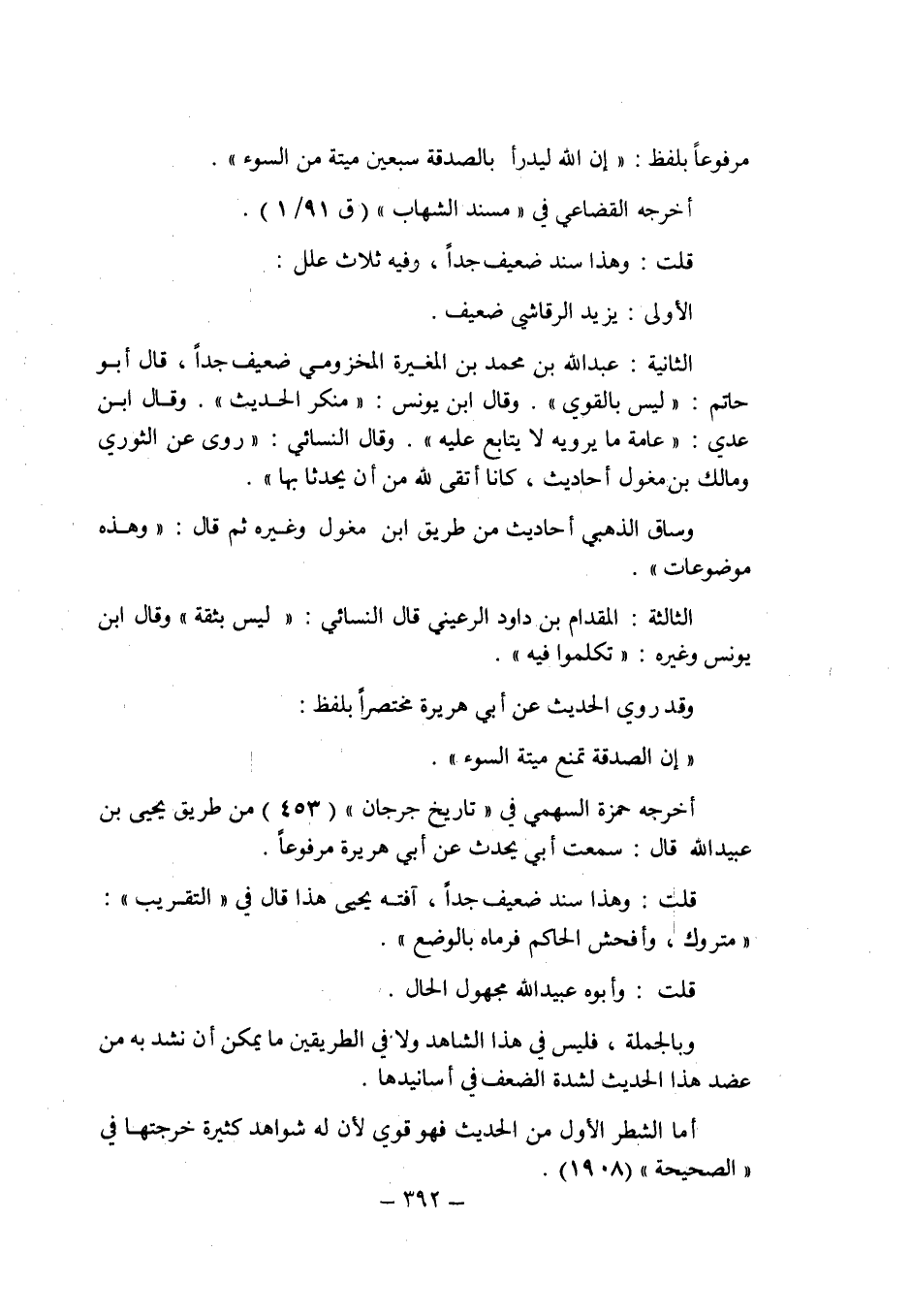 وقد روى الحديث عن أبى هريرة مختصرا بلفظ: " إن الصدقة تمنع ميتة السوء ".