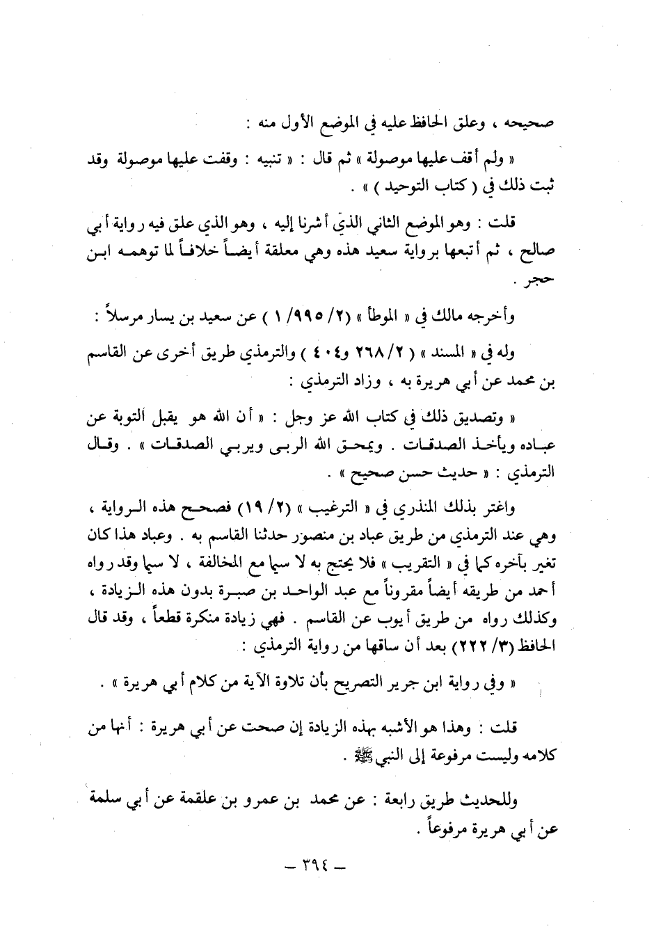 وله فى " المسند " (2/268 و404) والترمذى طريق أخرى عن القاسم بن محمد عن أبى هريرة به , وزاد الترمذى: " وتصديق ذلك فى كتاب الله عز وجل: (أن الله هو يقبل التوبة عن عباده ويأخذ الصدقات) . (ويمحق الله الربى ويربى الصدقات) " وقال الترمذى: " حديث حسن صحيح ".