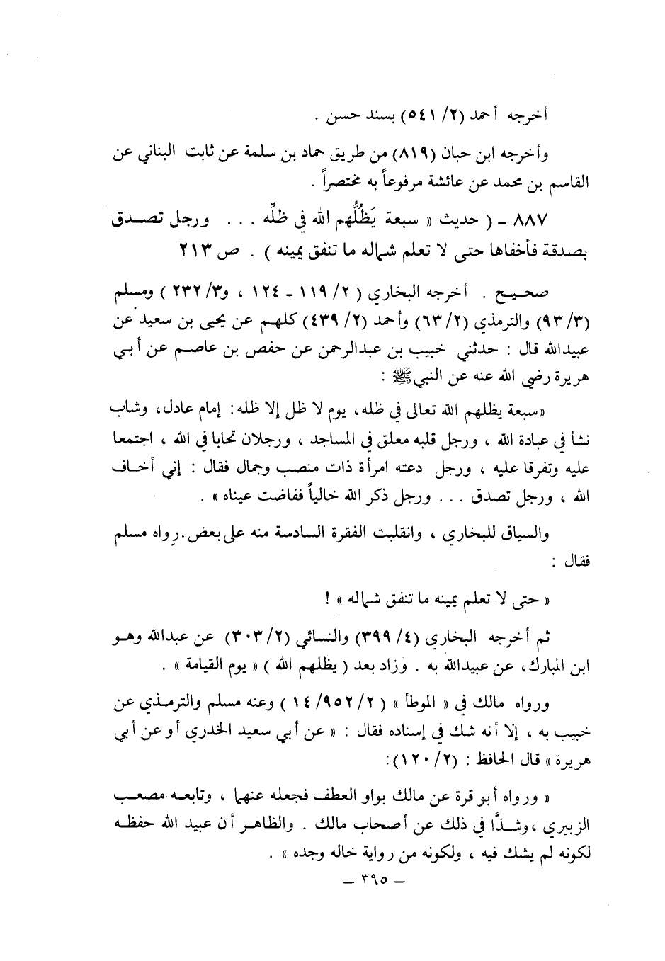 (887) - (حديث: " سبعة يظلهم الله فى ظله ... ورجل تصدق بصدقة فأخفاها حتى لا تعلم شماله ما تنفق يمينه " (ص 213) .
