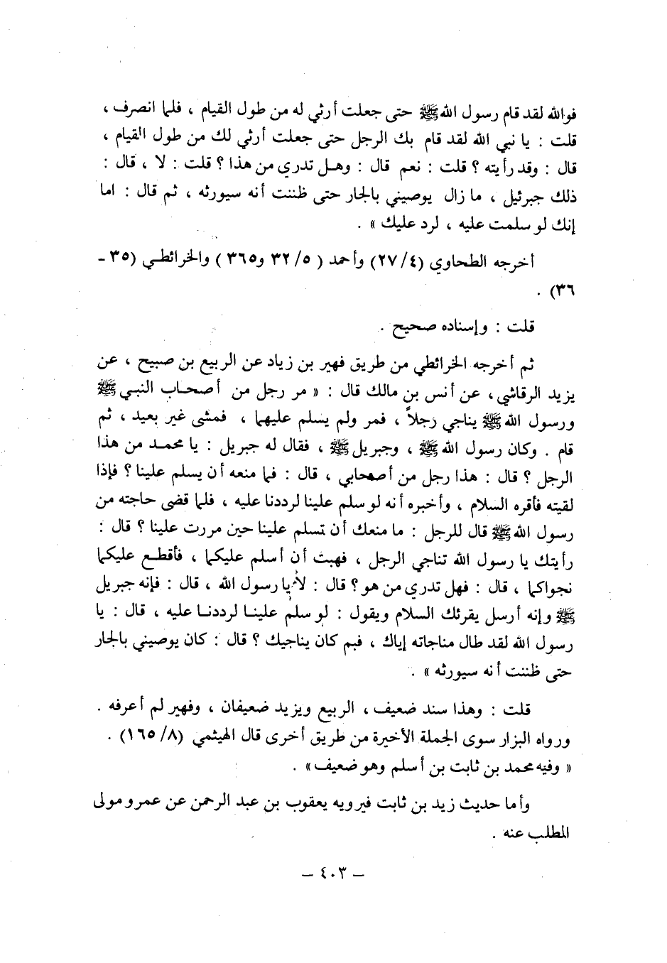 ثم أخرجه الخرائطى من طريق فهير بن زياد عن الربيع بن صبيح , عن يزيد الرقاشى , عن أنس بن مالك قال: " مر رجل من أصحاب النبى صلى الله عليه وسلم ورسول الله صلى الله عليه وسلم يناجى رجلا , فمر ولم يسلم عليهما , فمشى غير بعيد , ثم قام. وكان رسول الله صلى الله عليه وسلم , وجبريل صلى الله عليه وسلم , فقال له جبريل: يا محمد من هذا الرجل؟ قال: هذا رجل من أصحابى , قال: فما منعه أن يسلم علينا؟ فإذا لقيته فأقره السلام , وأخبره أنه لو سلم علينا لرددنا عليه , فلما قضى حاجته من رسول الله صلى الله عليه وسلم قال للرجل: مامنعك أن تسلم علينا حين مررت علينا؟ قال: رأيتك يا رسول الله تناجى الرجل , فهبت أن أسلم عليكما , فأقطع عليكما نجواكما , قال: فهل تدرى من هو؟ قال: لا يا رسول الله , قال: فإنه جبريل صلى الله عليه وسلم وإنه أرسل يقرئك السلام ويقول: لو سلم علينا لرددنا عليه , قال: يا رسول الله لقد طال مناجاته إياك , فبم كان يناجيك؟ قال: كان يوصينى بالجار حتى ظننت أنه سيورثه".