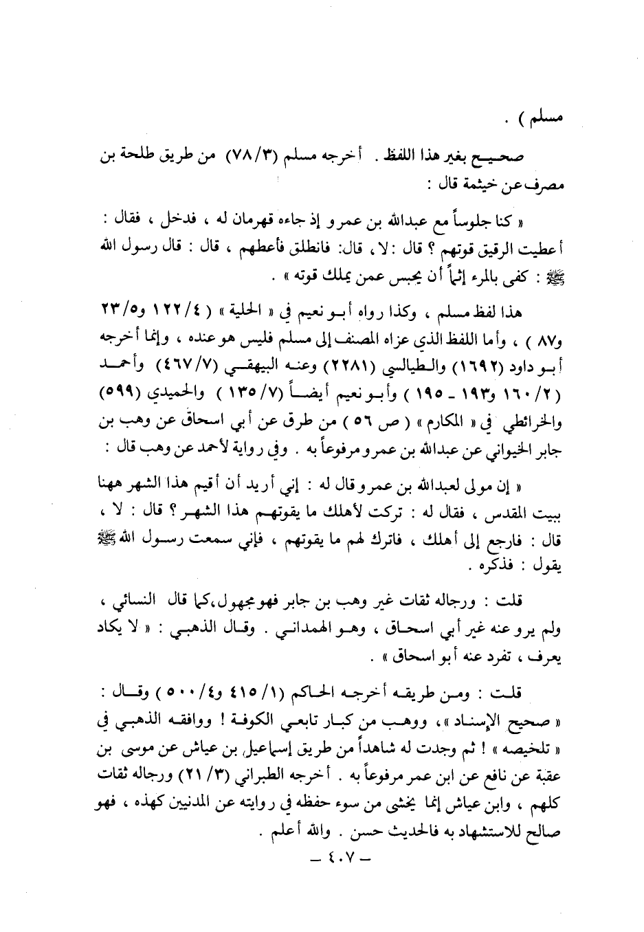 وفى رواية لأحمد عن وهب قال: " إن مولى لعبد الله بن عمرو قال له: إنى أريد أن أقيم هذا الشهر ههنا ببيت المقدس , فقال له: تركت لأهلك ما يقوتهم هذا الشهر؟ قال: لا , قال: فارجع إلى أهلك , فاترك لهم ما يقوتهم , فإنى سمعت رسول الله صلى الله عليه وسلم يقول: فذكره ".