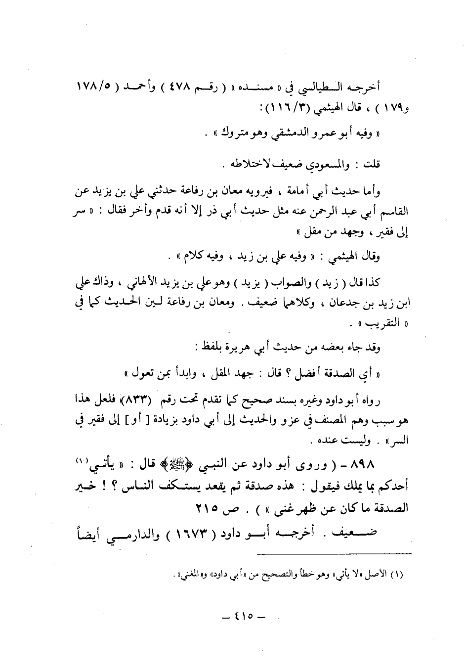 (898) - (وروى أبو داود عن النبى صلى الله عليه وسلم قال: " يأتى (1) أحدكم بما يملك فيقول: هذه صدقة ثم يقعد يستكف الناس؟ ! خير الصدقة ما كان عن ظهر غنى " (ص 215)