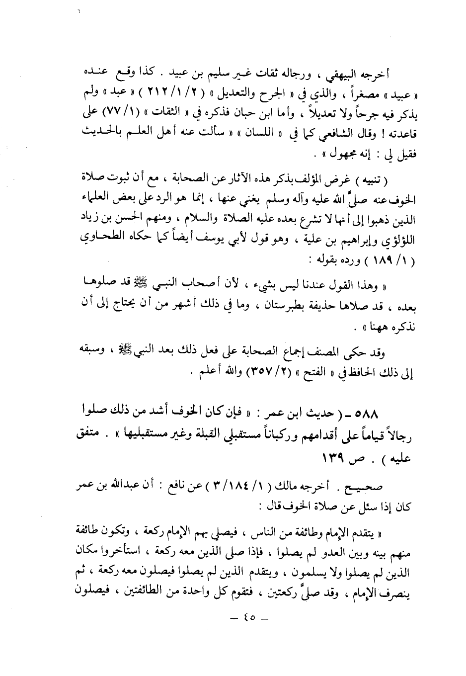 (588) - (حديث ابن عمر: " فإن كان الخوف أشد من ذلك صلوا رجالاً قياماً على أقدامهم وركباناً مستقبلى القبلة وغير مستقبليها " متفق عليه (ص 139) .