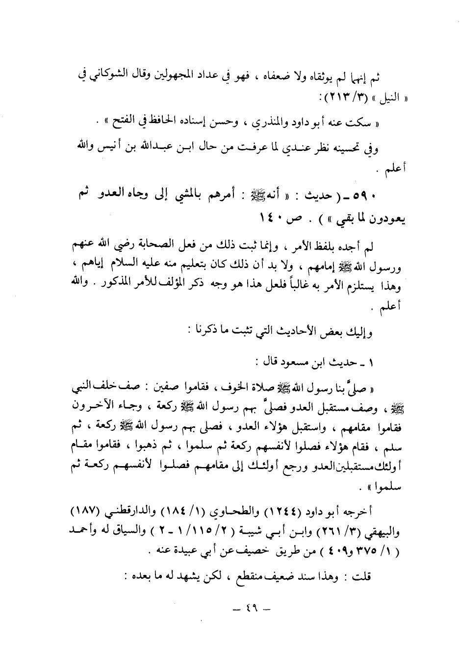 (590) - (حديث: " أنه صلى الله عليه وسلم: أمرهم بالمشى إلى وجاه العدو , ثم يعودون لما بقى " (ص 140) .