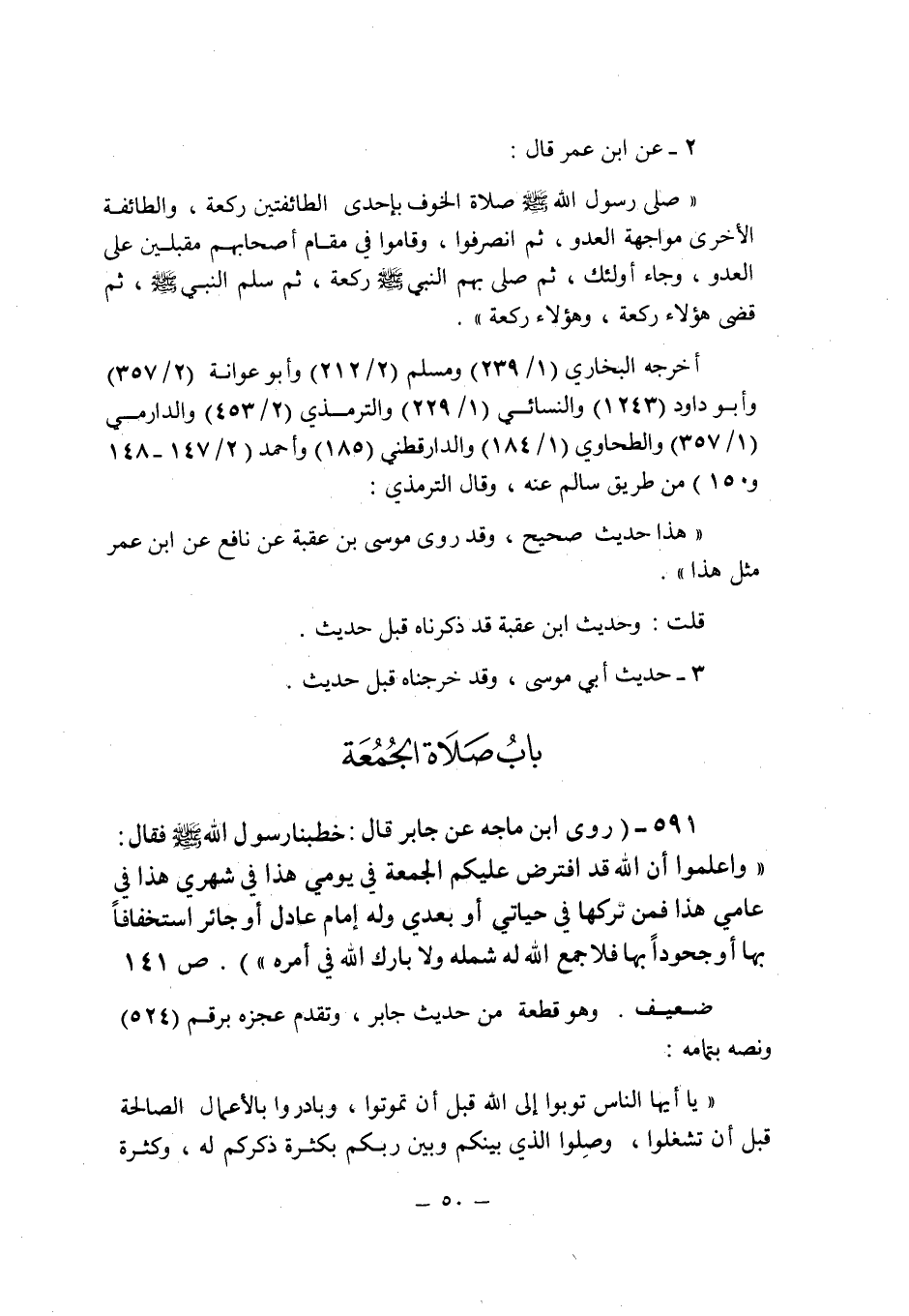 (591) - (روى ابن ماجه عن جابر قال: خطبنا رسول الله صلى الله عليه وسلم فقال: " واعلموا أن الله قد افترض عليكم الجمعة فى يومى هذا فى شهرى هذا فى عامى هذا فمن تركها فى حياتى أو بعدى وله إمام عادل أو جائر استخفافاً بها أو جحوداً بها فلا جمع الله له شمله ولا بارك الله فى أمره " (ص 141) .