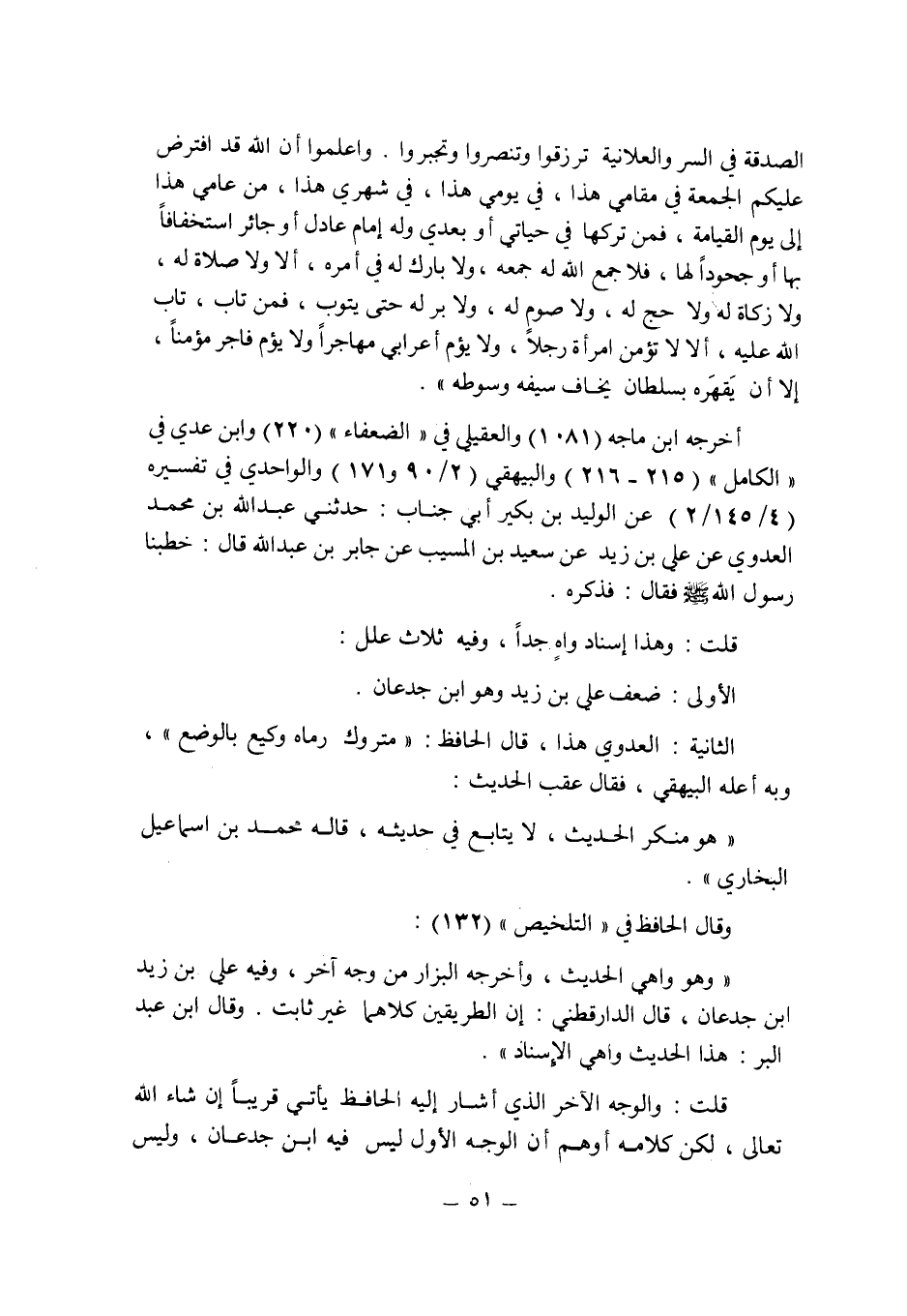 الصدقة فى السر والعلانية ترزقوا وتنصروا وتجبروا. واعلموا أن الله قد افترض عليكم الجمعة فى مقامى هذا , فى يومى هذا , فى شهرى هذا , من عامى هذا إلى يوم القيامة , فمن تركها فى حياتى أو بعدى وله إمام عادل أو جائر استخفافاً بها أو جحوداً لها , فلا جمع الله له جمعه , ولا بارك له فى أمره , ألا ولا صلاة له , ولا زكاة له ولا حج له , ولا صوم له , ولا بر له حتى يتوب , فمن تاب , تاب الله عليه , ألا لا تؤمن امرأة رجلاً , ولا يؤم أعرابى مهاجراً ولا يؤم فاجر مؤمناً , إلا أن يقهره بسلطان يخاف سيفه وسوطه ".