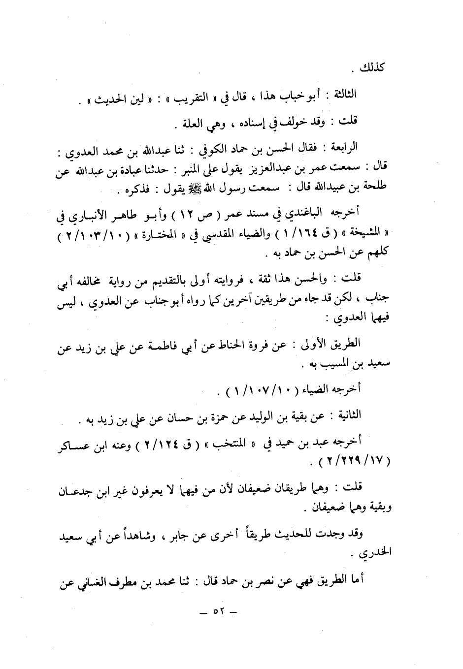 قلت: وقد خولف فى إسناده , وهى العلة الرابعة: فقال الحسن بن حماد الكوفى: حدثنا عبد الله بن محمد العدوى: قال: سمعت عمر بن عبد العزيز يقول على المنبر: حدثنا عبادة بن عبد الله عن طلحة بن عبيد الله قال: سمعت رسول الله صلى الله عليه وسلم يقول: فذكره.