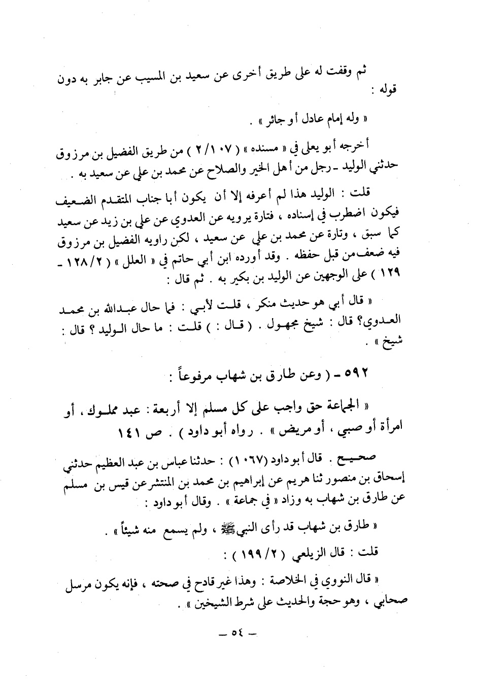 (592) - (وعن طارق بن شهاب مرفوعاً: " الجماعة [1] حق واجب على كل مسلم إلا أربعة: عبد مملوك , أو امرأة , أو صبى , أو مريض " رواه أبو داود (ص 141) .