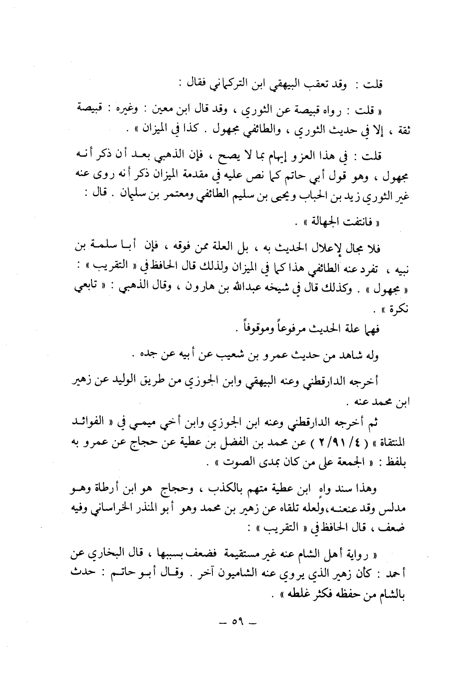 قلت: وقد تعقب البيهقى ابن التركمانى فقال: " قلت: رواه قبيصة عن الثورى , وقد قال ابن معين: وغيره: قبيصة ثقة , إلا فى حديث الثورى , والطائفى مجهول. كذا فى الميزان ".