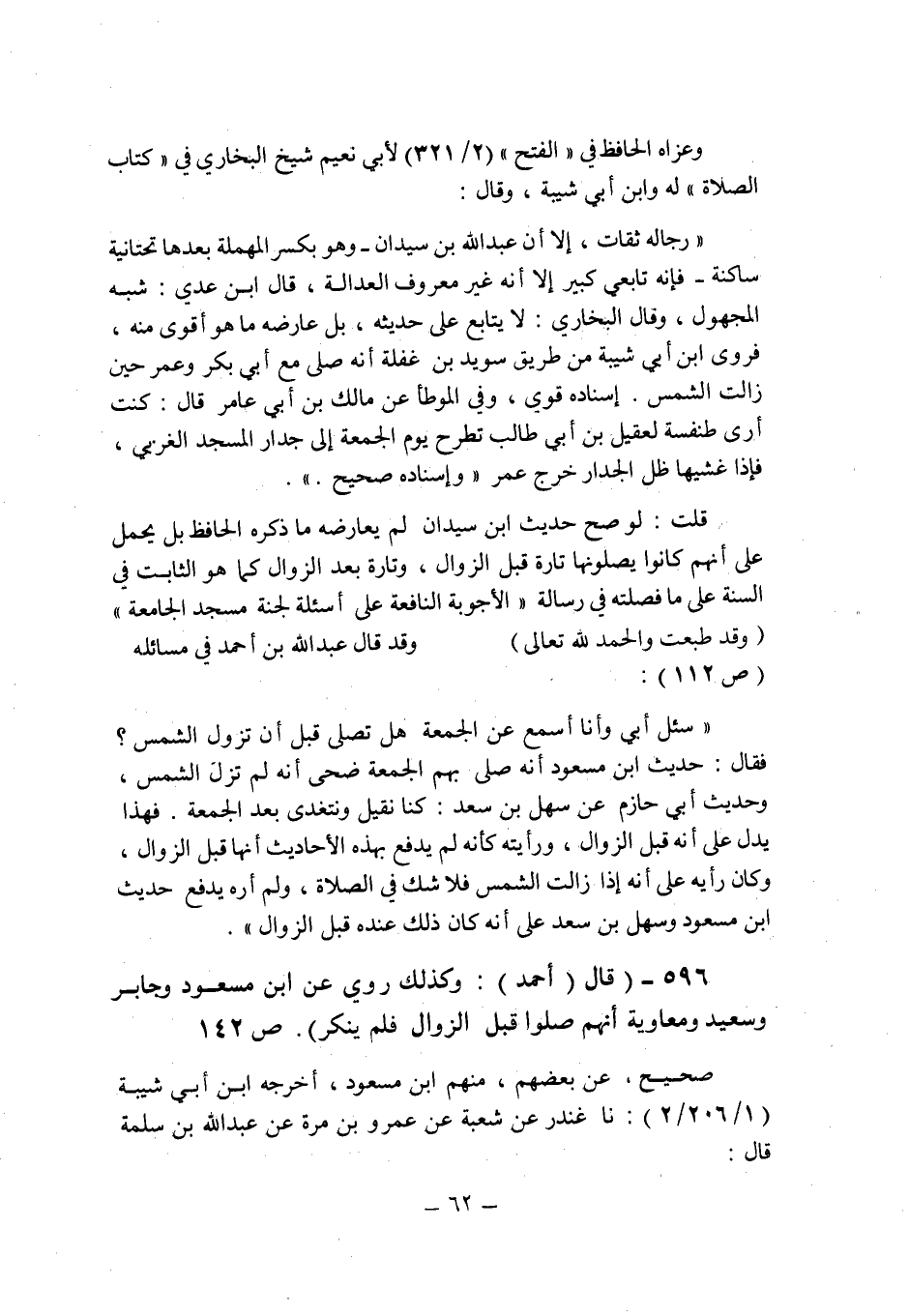 (596) - (قال أحمد: " وكذلك روى عن ابن مسعود وجابر وسعيد ومعاوية أنهم صلوا قبل الزوال فلم ينكر " (ص 142) .