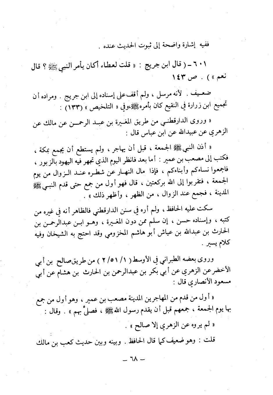 لأنه مرسل , ولم أقف على إسناده إلى ابن جريج [2] . ومراده أن تجميع ابن زرارة فى النقيع كان بأمره صلى الله عليه وسلم وفى " التلخيص " (133) : " وروى الدارقطنى من طريق المغيرة بن عبد الرحمن عن مالك عن الزهرى عن عبيد الله عن ابن عباس قال: " أذن النبى صلى الله عليه وسلم الجمعة , قبل أن يهاجر , ولم يستطع أن يجمع بمكة , فكتب إلى مصعب بن عمير: أما بعد فانظر اليوم الذى تجهر فيه اليهود بالزبور , فاجمعوا نساءكم وأبناءكم , فإذا مال النهار عن شطره عند الزوال من يوم الجمعة , فتقربوا إلى الله بركعتين , قال فهو أول من جمع حتى قدم النبى صلى الله عليه وسلم المدينة , فجمع عند الزوال , من الظهر , وأظهر ذلك ".