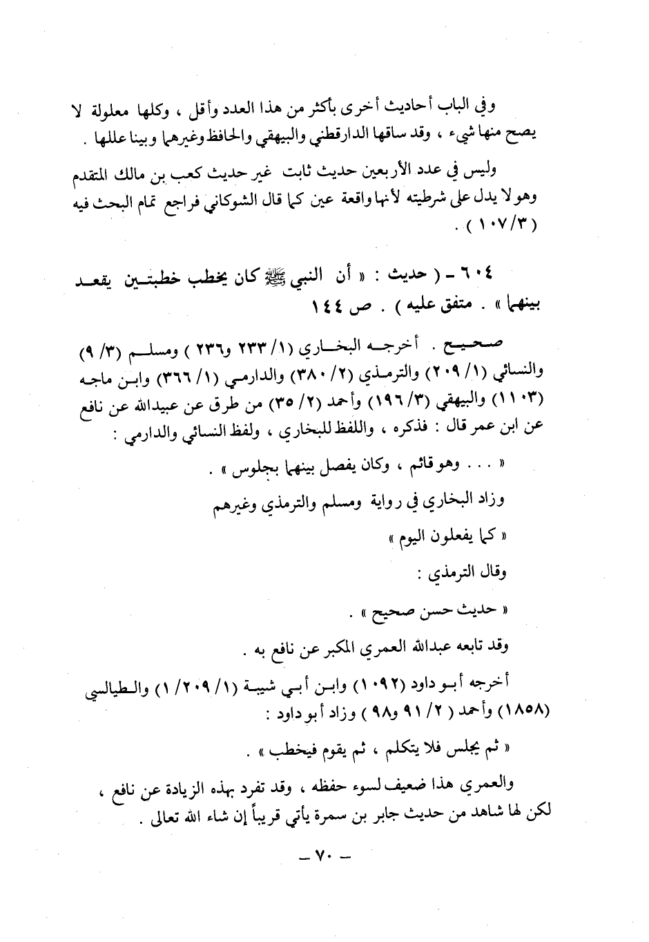 (604) - (حديث: " أن النبى صلى الله عليه وسلم كان يخطب خطبتين يقعد بينهما ". متفق عليه (ص 144) .