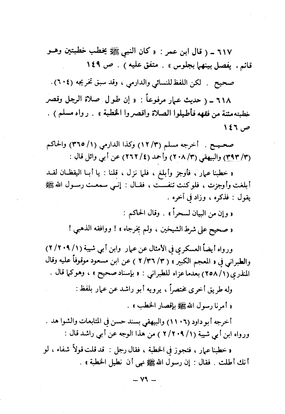 (617) - (قال ابن عمر: " كان النبى صلى الله عليه وسلم يخطب خطبتين وهو قائم , يفصل بينهما بجلوس " متفق عليه (ص 149) .