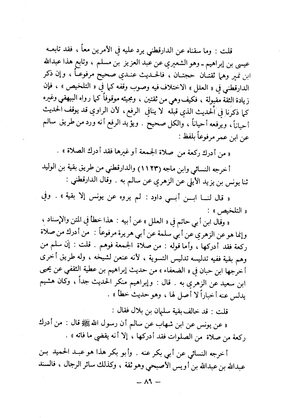 قلت: وما سقناه عن الدارقطنى يرد عليه فى الأمرين معا , فقد تابعه عيسى بن إبراهيم ـ وهو الشعيرى - عن عبد العزيز بن مسلم , وتابع هذا عبد الله بن نمير وهما ثقتان حجتان , فالحديث عندى صحيح مرفوعا , وإن ذكر الدارقطنى فى " العلل " الاختلاف فيه وصوب وقفه كما فى " التلخيص " , فإن زيادة الثقة مقبولة , فكيف وهى من ثقتين , ومجيئه موقوفا كما رواه البيهقى وغيره كما