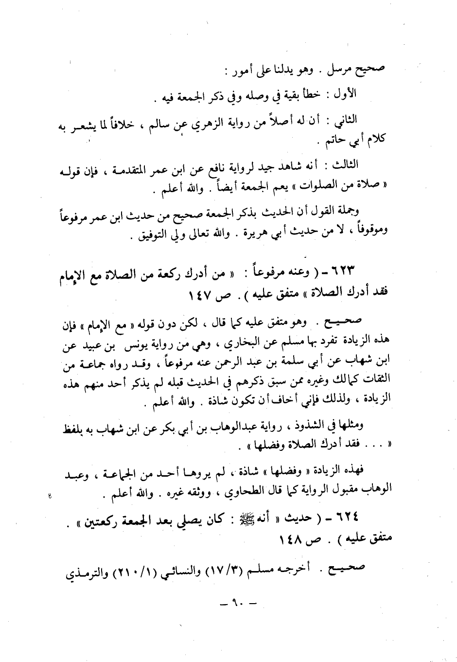 الثالث: إنه شاهد جيد لرواية نافع عن ابن عمر المتقدمة , فإن قوله " صلاة من الصلوات " يعم الجمعة أيضا , والله أعلم.