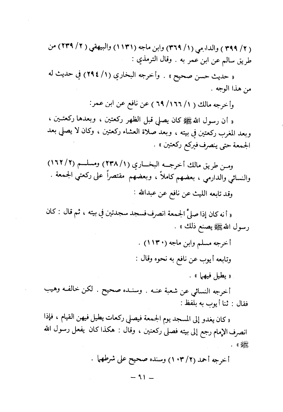 وقد تابعه الليث عن نافع عن عبد الله: " أنه كان إذا صلى الجمعة انصرف فسجد سجدتين فى بيته , ثم قال: كان رسول الله صلى الله عليه وسلم يصنع ذلك " أخرجه مسلم وابن ماجه (1130) .