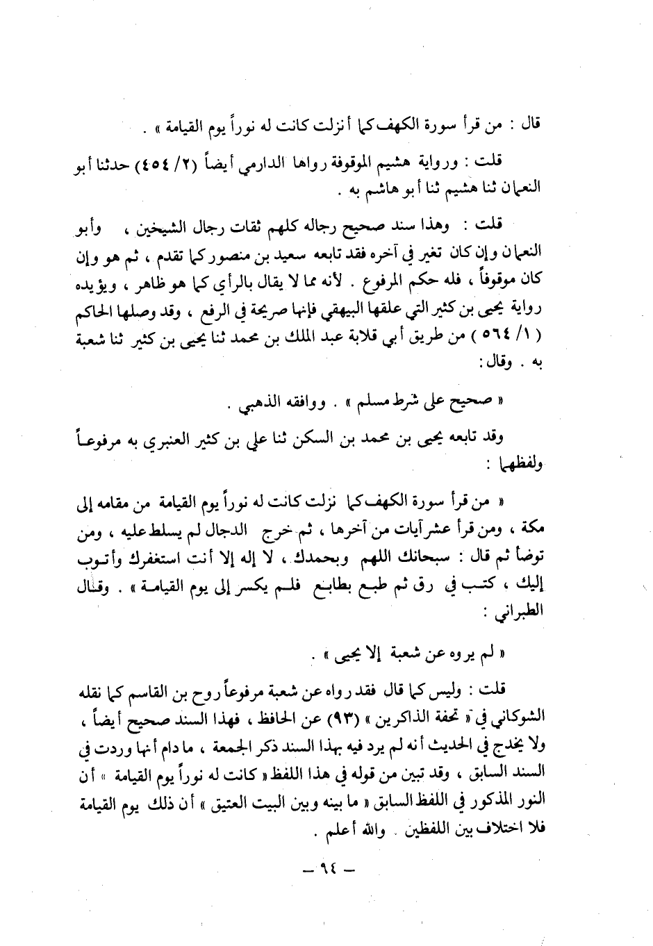 قلت: وليس كما قال فقد رواه عن شعبة مرفوعا روح بن القاسم كما نقله الشوكانى فى " تحفة الذاكرين " عن الحافظ , فهذا السند صحيح أيضا , ولا يخدج فى الحديث أنه لم يرد فيه بهذا السند ذكر الجمعة , ما دام أنها وردت فى السند السابق , وقد تبين من قوله فى هذا اللفظ " كانت له نورا يوم القيامة " أن النور المذكور فى اللفظ السابق " ما بينه وبين البيت العتيق " أن ذلك يوم القيامة فلا اختلاف بين اللفظين , والله أعلم.