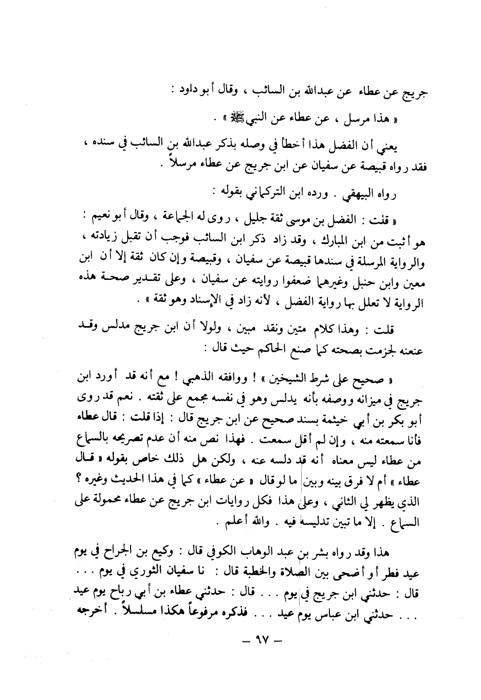 قلت: وهذا كلام متين ونقد مبين , ولولا أن ابن جريج مدلس وقد عنعنه لجزمت بصحته كما صنع الحاكم حيث قال: " صحيح على شرط الشيخين "! ووافقه الذهبى! مع أنه قد أورد ابن جريج فى ميزانه ووصفه بأنه يدلس وهو فى نفسه مجمع على ثقته. نعم قد روى أبو بكر بن أبى خيثمة بسند صحيح عن ابن جريج قال: إذا قلت: قال عطاء فأنا سمعته منه , وإن لم أقل سمعت. فهذا نص منه أن عدم تصريحه بالسماع من عطاء ليس معناه أنه قد دلسه عنه , ولكن هل ذلك خاص بقوله " قال عطاء " أم لا فرق بينه وبين ما لو