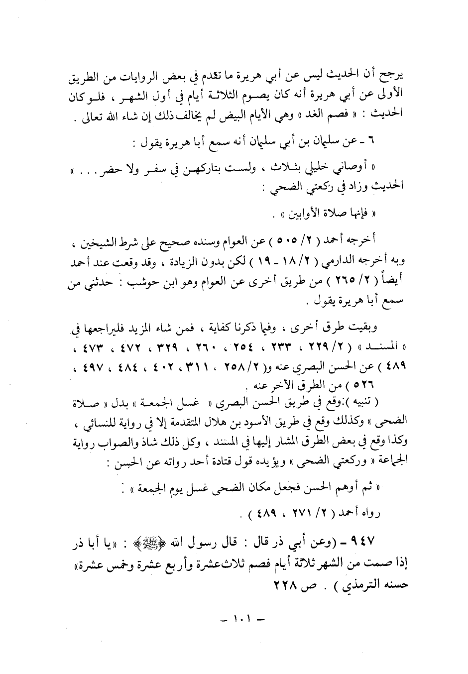 (تنبيه) : وقع فى طريق الحسن البصرى " غسل الجمعة " بدل " صلاة الضحى " وكذلك وقع فى طريق الأسود بن هلال المتقدمة إلا فى رواية للنسائى , وكذا وقع فى بعض الطرق المشار إليها فى المسند , وكل ذلك شاذ والصواب رواية الجماعة " وركعتى الضحى " ويؤيده قول قتادة أحد رواته عن الحسن: " ثم أوهم الحسن فجعل مكان الضحى غسل يوم الجمعة ". رواه أحمد (2/271 , 489) .