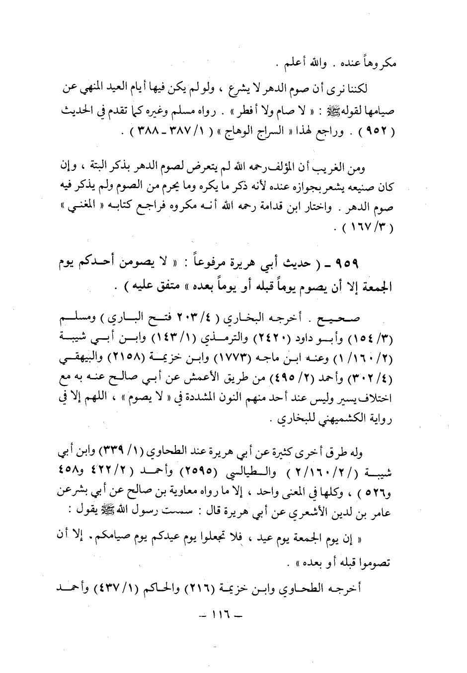 وله طرق أخرى كثيرة عن أبى هريرة عند الطحاوى (1/339) وابن أبى شيبة (2/160/2) والطيالسى (2595) وأحمد (2/422 و458 و526) , وكلها فى المعنى واحد , إلا ما رواه معاوية بن صالح عن أبى بشر عن عامر بن لدين الأشعرى عن أبى هريرة قال: سمعت رسول الله صلى الله عليه وسلم يقول: " إن يوم الجمعة يوم عيد , فلا تجعلوا يوم عيدكم يوم صيامكم , إلا أن تصوموا