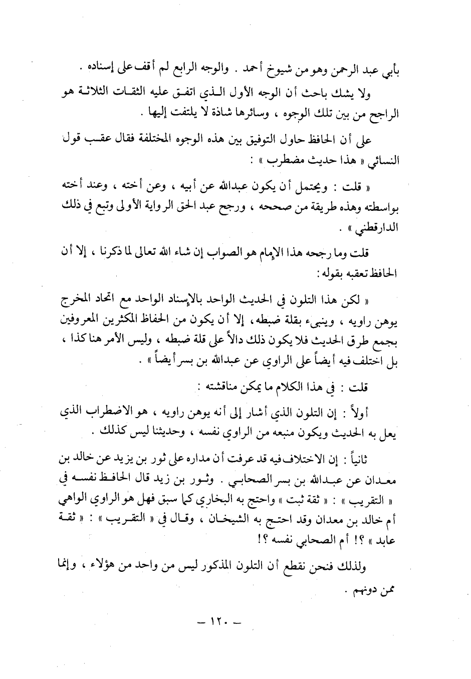 قلت: وما رجحه هذا الإمام هو الصواب إن شاء الله تعالى لما ذكرنا , إلا أن الحافظ تعقبه بقوله: " لكن هذا التلون فى الحديث الواحد بالإسناد الواحد مع اتحاد المخرج يوهن راويه , وينبىء بقلة ضبطه , إلا أن يكون من الحفاظ المكثرين المعروفين بجمع طرق الحديث فلا يكون ذلك دالا على قلة ضبطه , وليس الأمر هنا كذا , بل اختلف فيه أيضا على الراوى عن عبد الله بن بسر أيضا ".