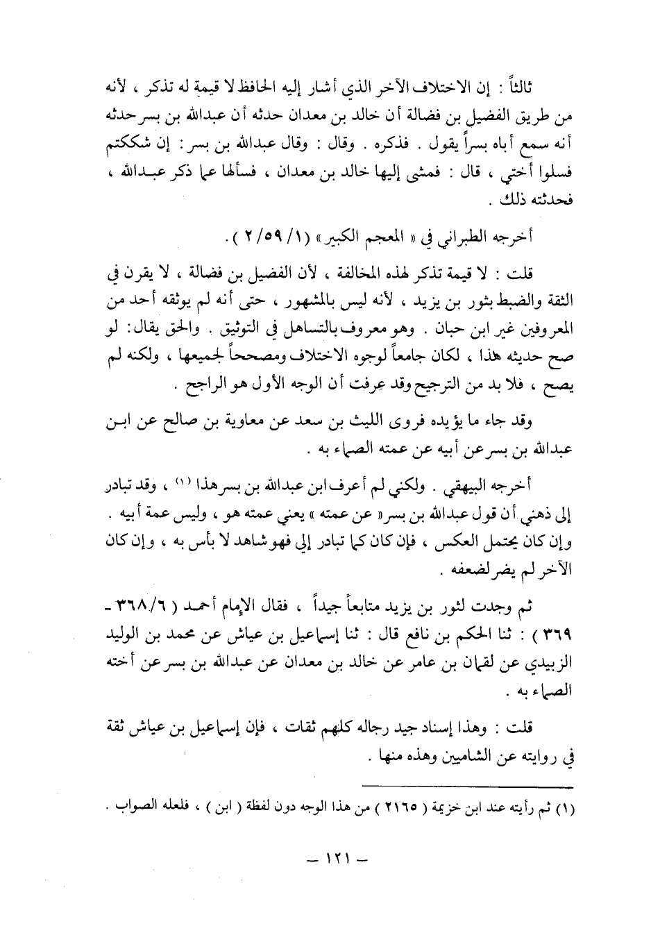ثالثا: إن الاختلاف الآخر الذى أشار إليه الحافظ لا قيمة له تذكر , لأنه من طريق الفضيل بن فضالة أن خالد بن معدان حدثه أن عبد الله بن بسر حدثه أنه سمع أباه بسرا يقول: فذكره. وقال: وقال عبد الله بن بسر: إن شككتم فسلوا أختى , قال: فمشى إليها خالد بن معدان , فسألها عما ذكر عبد الله , فحدثته ذلك.