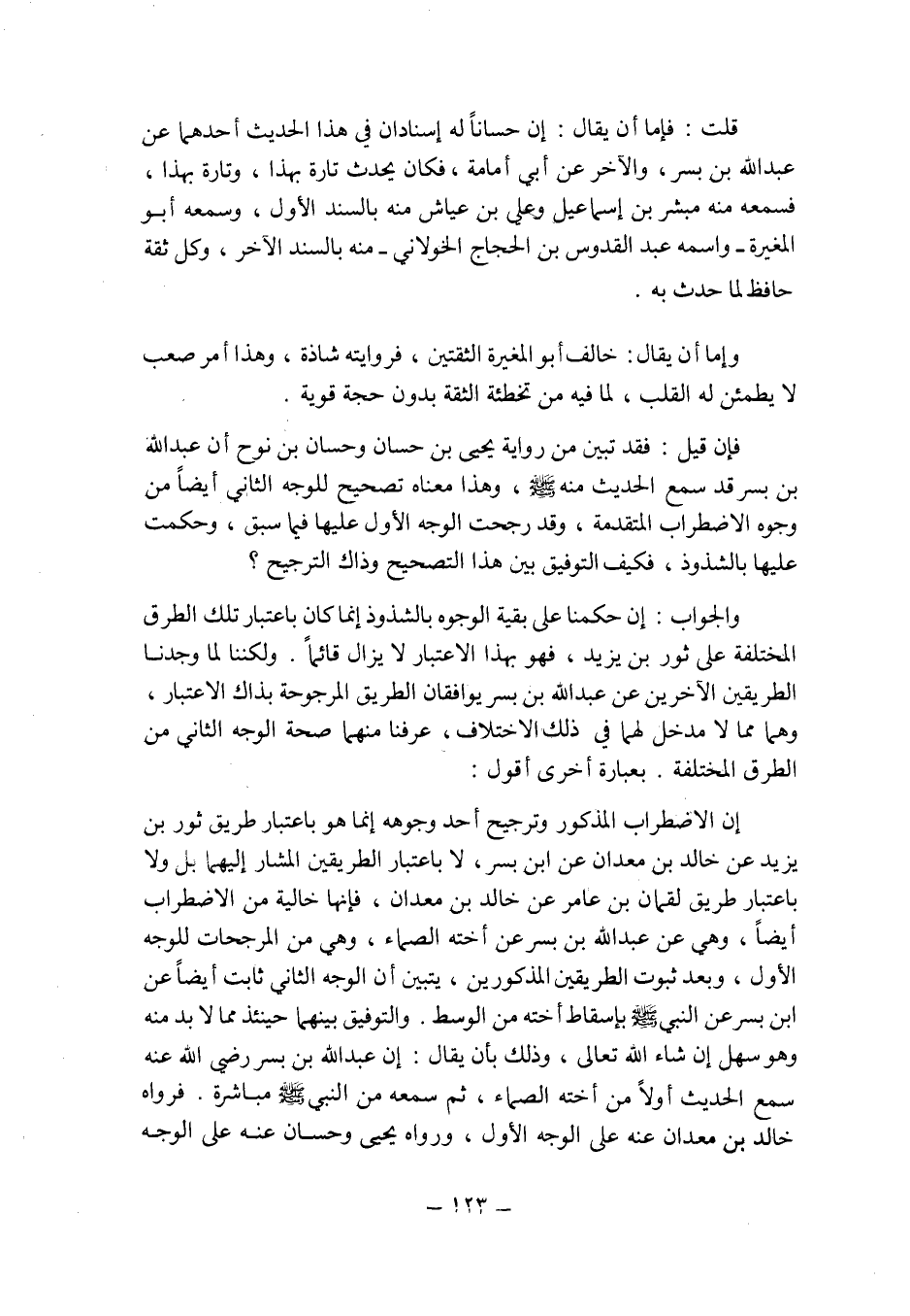 والجواب: إن حكمنا على بقية الوجوه بالشذوذ إنما كان باعتبار تلك الطرق المختلفة على ثور بن يزيد , فهو بهذا الاعتبار لا يزال قائما. ولكننا لما وجدنا الطريقين الآخرين عن عبد الله بن بسر يوافقان الطريق المرجوحة بذاك الاعتبار , وهما مما لا مدخل لهما فى ذلك الاختلاف , عرفنا منهما صحة الوجه الثانى من الطرق المختلفة.
