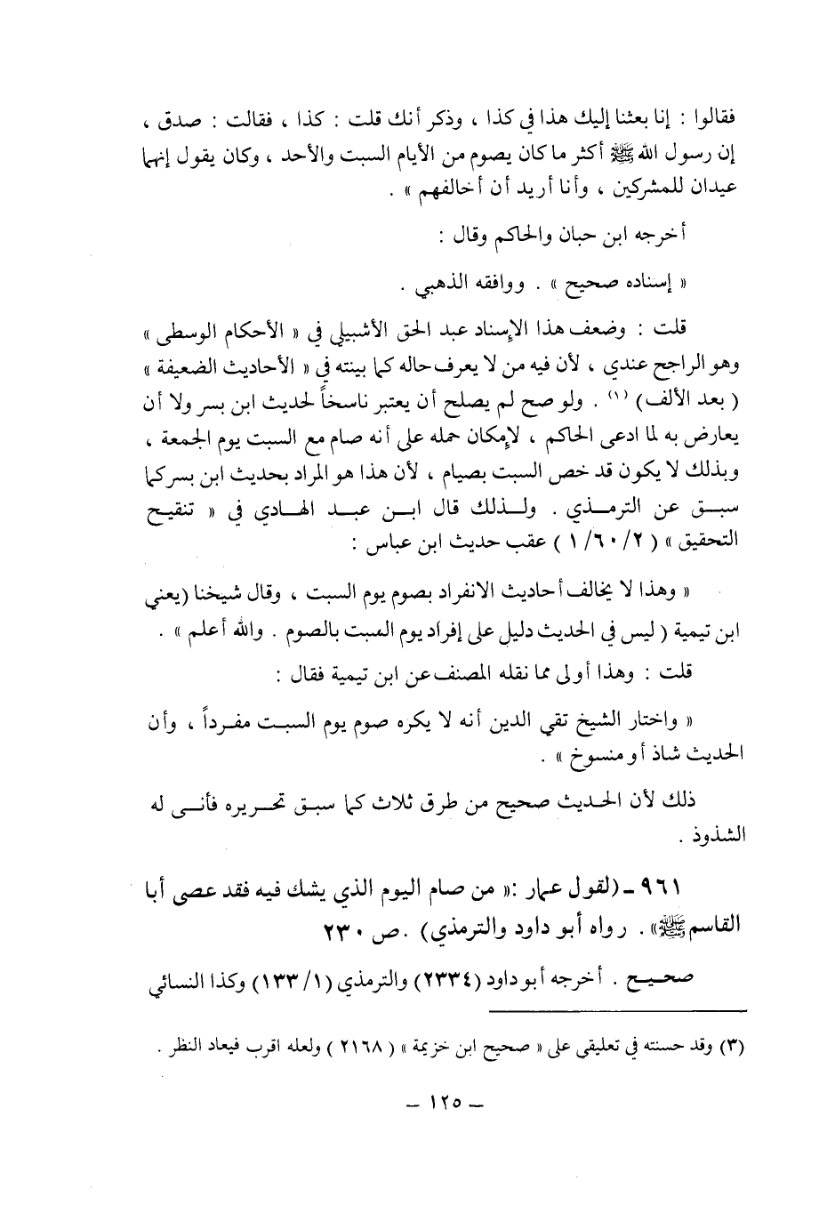 قلت: وضعف هذا الإسناد عبد الحق الأشبيلى فى " الأحكام الوسطى " وهو الراجح عندى , لأن فيه من لا يعرف حاله كما بينته فى " الأحاديث الضعيفة " (بعد الألف) (1) . ولو صح لم يصلح أن يعتبر ناسخا لحديث ابن بسر ولا أن يعارض به لما [1] ادعى الحاكم , لإمكان حمله على أنه صام مع السبت يوم الجمعة , وبذلك لا يكون قد خص السبت بصيام , لأن هذا هو المراد بحديث ابن بسر كما سبق عن الترمذى. ولذلك قال ابن عبد الهادى فى " تنقيح التحقيق " (2/60/1) عقب حديث ابن عباس: " وهذا لا يخالف أحاديث الانفراد بصوم يوم السبت , وقال شيخنا (يعنى ابن تيمية) ليس فى الحديث دليل على إفراد يوم السبت بالصوم , والله أعلم ".