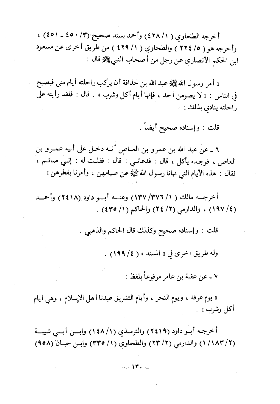 7 ـ عن عقبة بن عامر مرفوعا بلفظ: " يوم عرفة , ويوم النحر , وأيام التشريق عيدنا أهل الإسلام , وهى أيام أكل وشرب ".