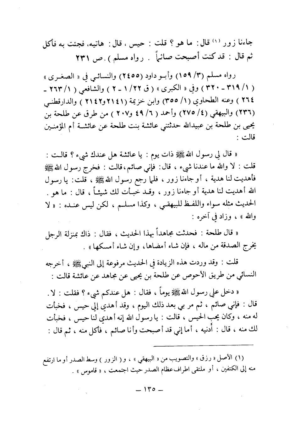 رواه مسلم (3/159) وأبو داود (2455) والنسائى فى " الصغرى " (1/319 ـ 320) وفى " الكبرى " (ق 22/1 ـ 2) والشافعى (1/263 ـ 264) وعنه الطحاوى (1/355) وابن خزيمة (2141 و2142) والدارقطنى (236) والبيهقى (4/275) وأحمد (6/49 و207) من طرق عن طلحة بن يحيى بن طلحة بن عبيد الله حدثتنى عائشة بنت طلحة عن عائشة أم المؤمنين قالت: " قال لى رسول الله صلى الله عليه وسلم ذات يوم: يا عائشة هل عندك شىء؟ قالت: قلت: لا والله ما عندنا شىء , قال: فإنى صائم , قالت: فخرج رسول الله صلى الله عليه وسلم فأهديت لنا هدية , أو جاءنا زور , فلما رجع رسول الله صلى الله عليه وسلم , قلت: يا رسول الله أهديت لنا هدية أو جاءنا زور , وقد خبأت لك شيئا , قال: ما هو ... " الحديث مثله سواء واللفظ للبيهقى , وكذا مسلم , لكن ليس عنده: " لا والله " , وزاد فى آخره: " قال طلحة: فحدثت مجاهدا بهذا الحديث , فقال: ذاك بمنزلة الرجل يخرج الصدقة من ماله , فإن شاء أمضاها , وإن شاء أمسكها ".