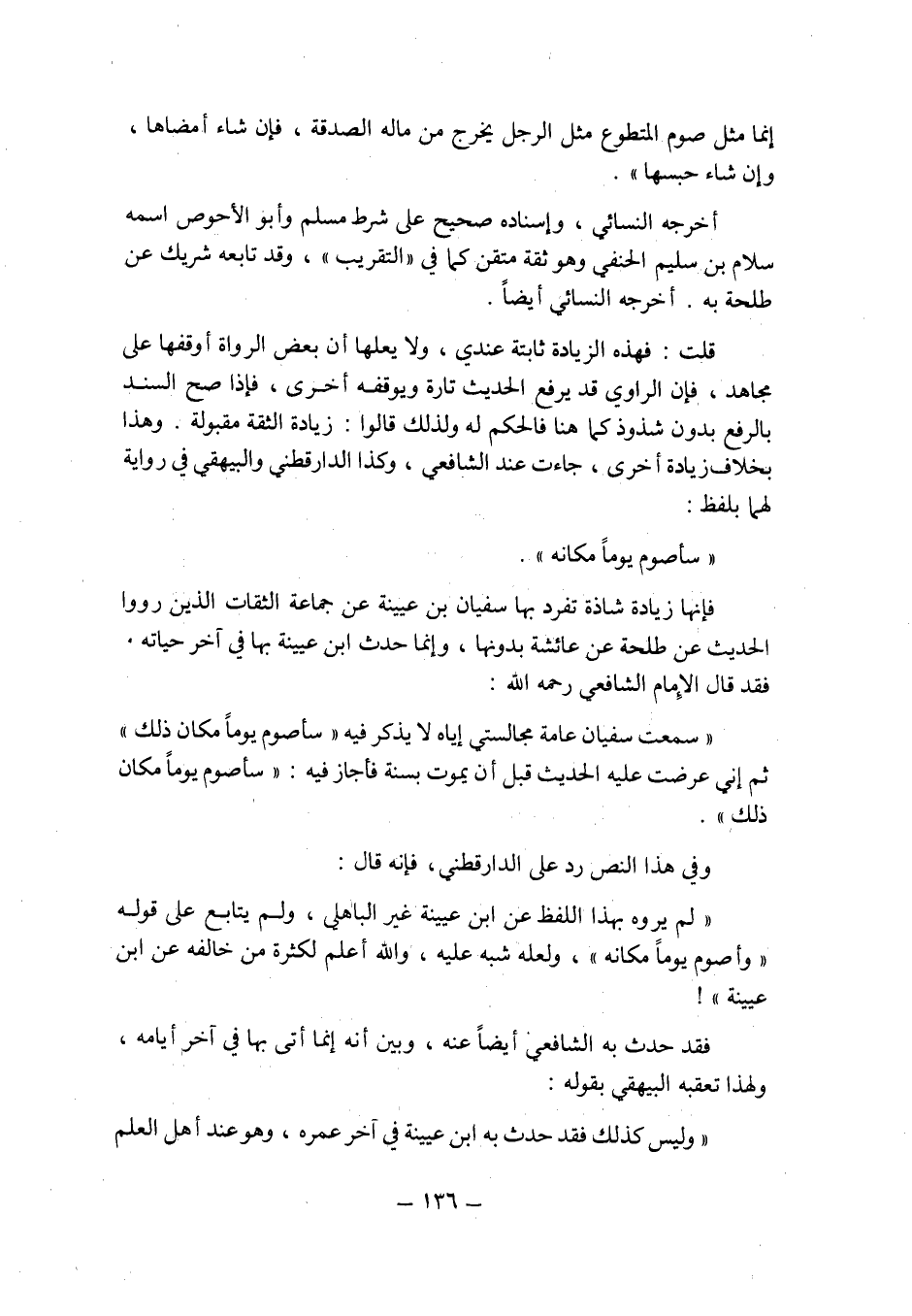 وفى هذا النص رد على الدارقطنى , فإنه قال: " لم يروه بهذا اللفظ عن ابن عيينة غير الباهلى , ولم يتابع على قوله " وأصوم يوما مكانه " , ولعله شبه عليه , والله أعلم لكثرة من خالفه عن ابن عيينة "!
