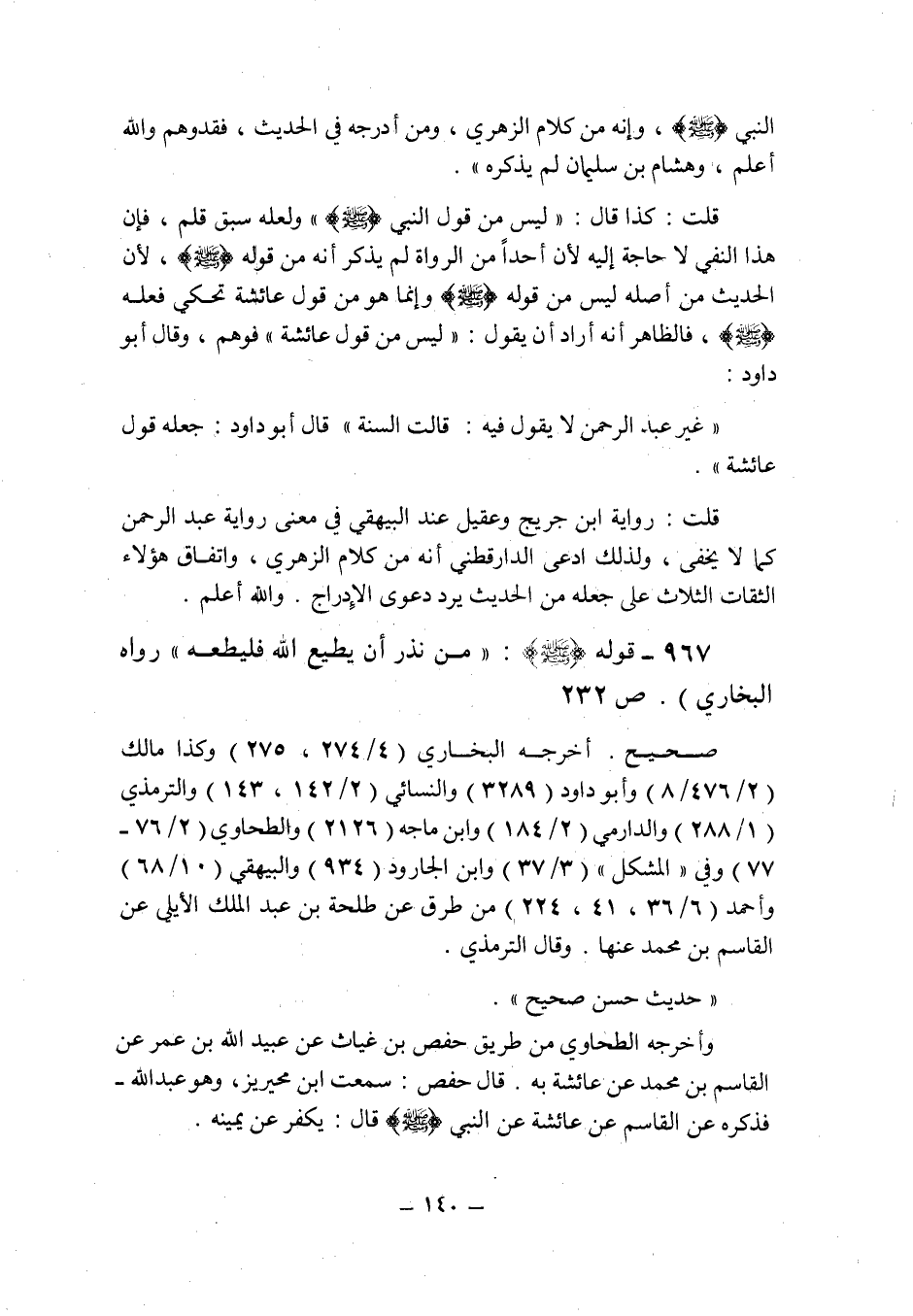 قلت: رواية ابن جريج وعقيل عند البيهقى فى معنى رواية عبد الرحمن كما لا يخفى , ولذلك ادعى الدارقطنى أنه من كلام الزهرى , واتفاق هؤلاء الثقات الثلاث على جعله من الحديث يرد دعوى الإدراج , والله أعلم.