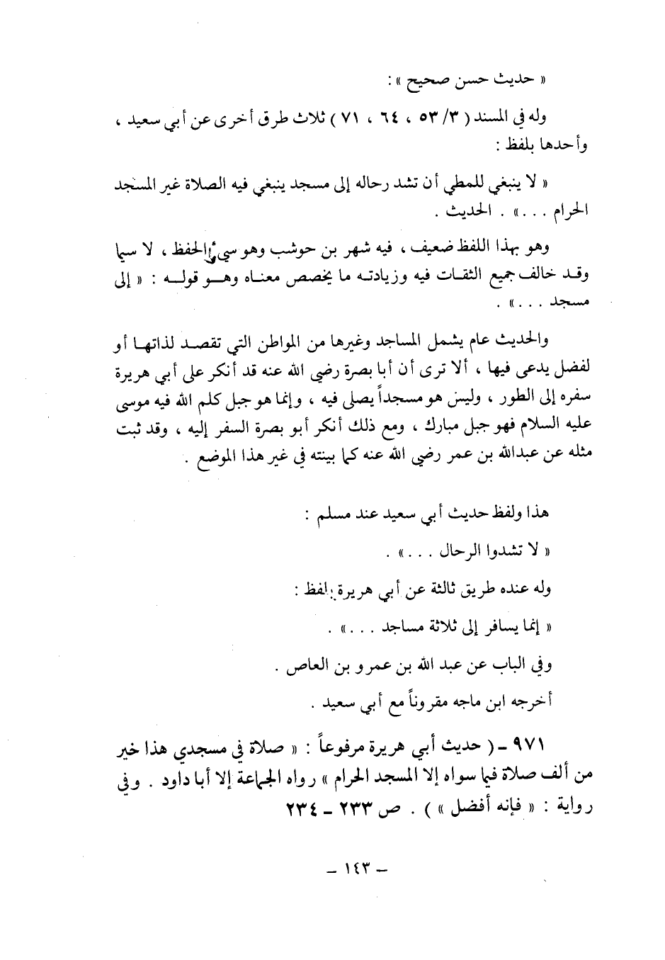 (971) - (حديث أبى هريرة مرفوعا: " صلاة فى مسجدى هذا خير من ألف صلاة فيما سواه إلا المسجد الحرام " رواه الجماعة إلا أبا داود. وفى رواية: " فإنه أفضل " (ص 233 ـ 234) .