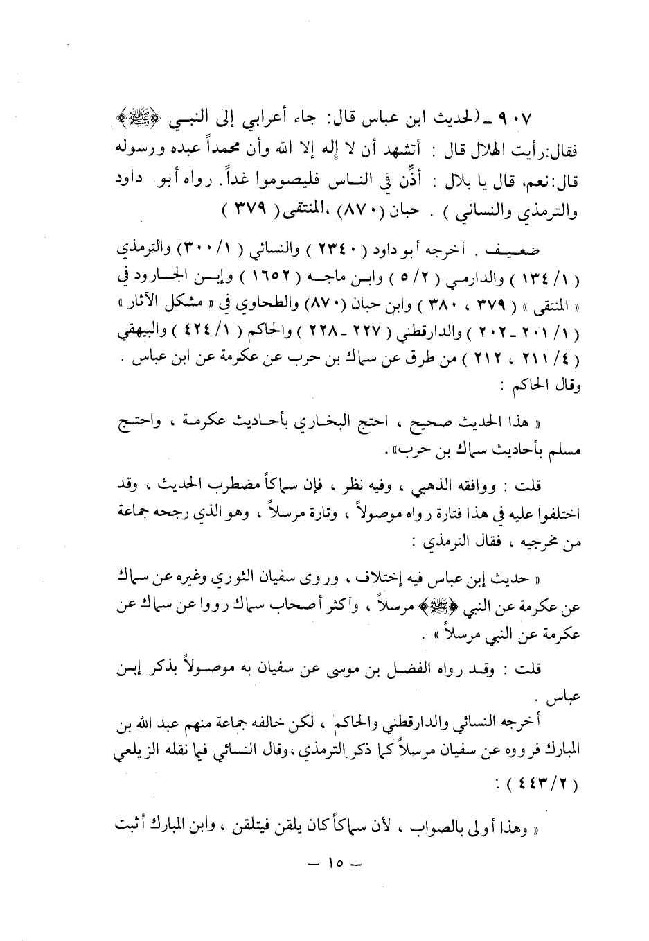 (907) - (لحديث ابن عباس قال: " جاء أعرابى إلى النبى صلى الله عليه وسلم فقال: رأيت الهلال قال: أتشهد أن لا إله إلا الله وأن محمدا عبده ورسوله قال: نعم , قال: يا بلال: أذن فى الناس فليصوموا غدا " رواه أبو داود والترمذى والنسائى.