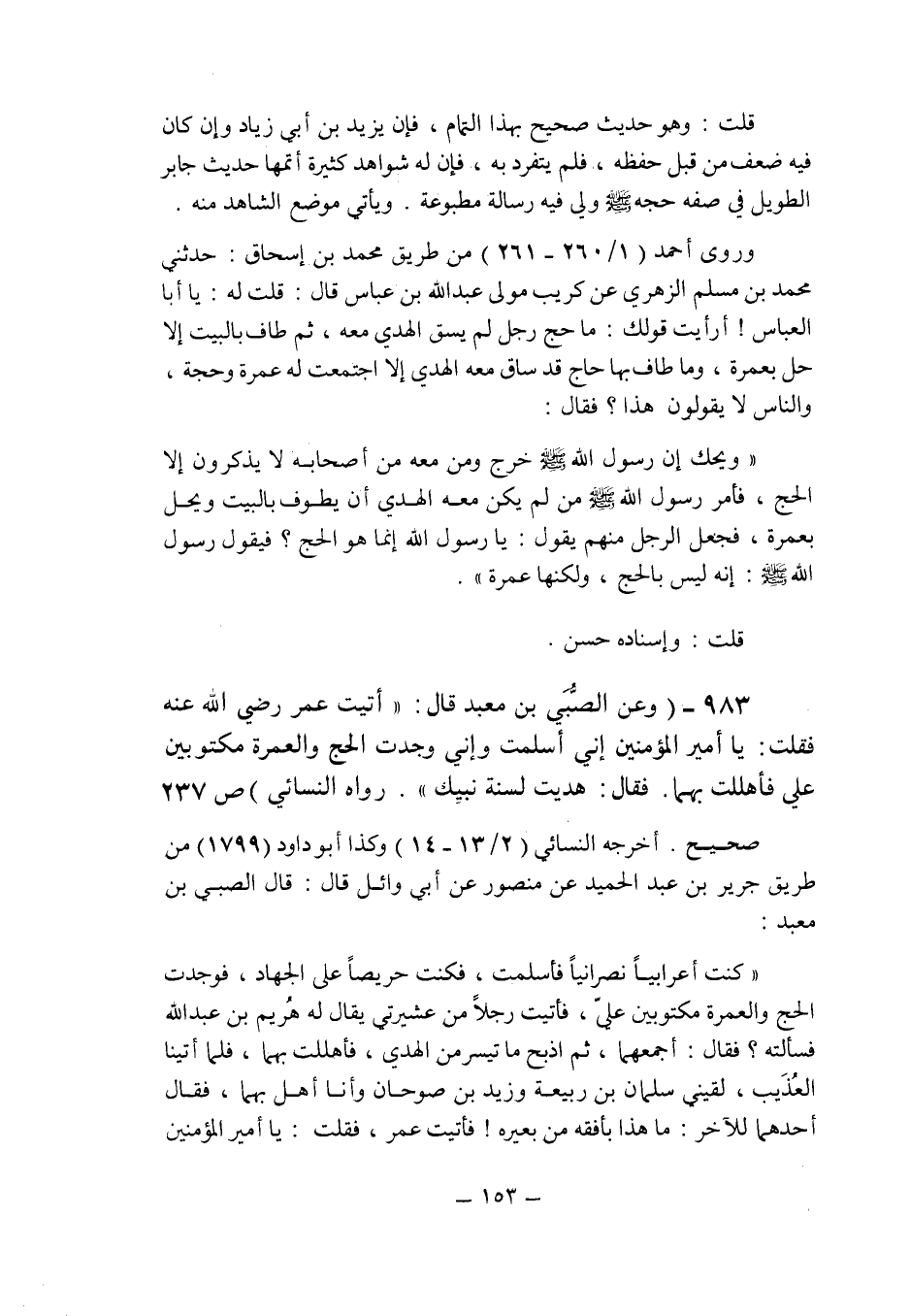 أخرجه النسائى (2/13 ـ 14) وكذا أبو داود (1799) من طريق جرير بن عبد الحميد عن منصور عن أبى وائل قال: قال الصبى بن معبد: " كنت أعرابيا نصرانيا فأسلمت , فكنت حريصا على الجهاد , فوجدت الحج والعمرة مكتوبين علىّ, فأتيت رجلا من عشيرتى يقال له هريم بن عبد الله فسألته؟ فقال: اجمعهما , ثم اذبح ما تيسر من الهدى , فأهللت بهما , فلما أتينا العذيب , لقينى سلمان بن ربيعة وزيد بن صوحان وأنا أهل بهما , فقال أحدهما للآخر: ما هذا بأفقه من بعيره! فأتيت عمر , فقلت: يا أمير المؤمنين