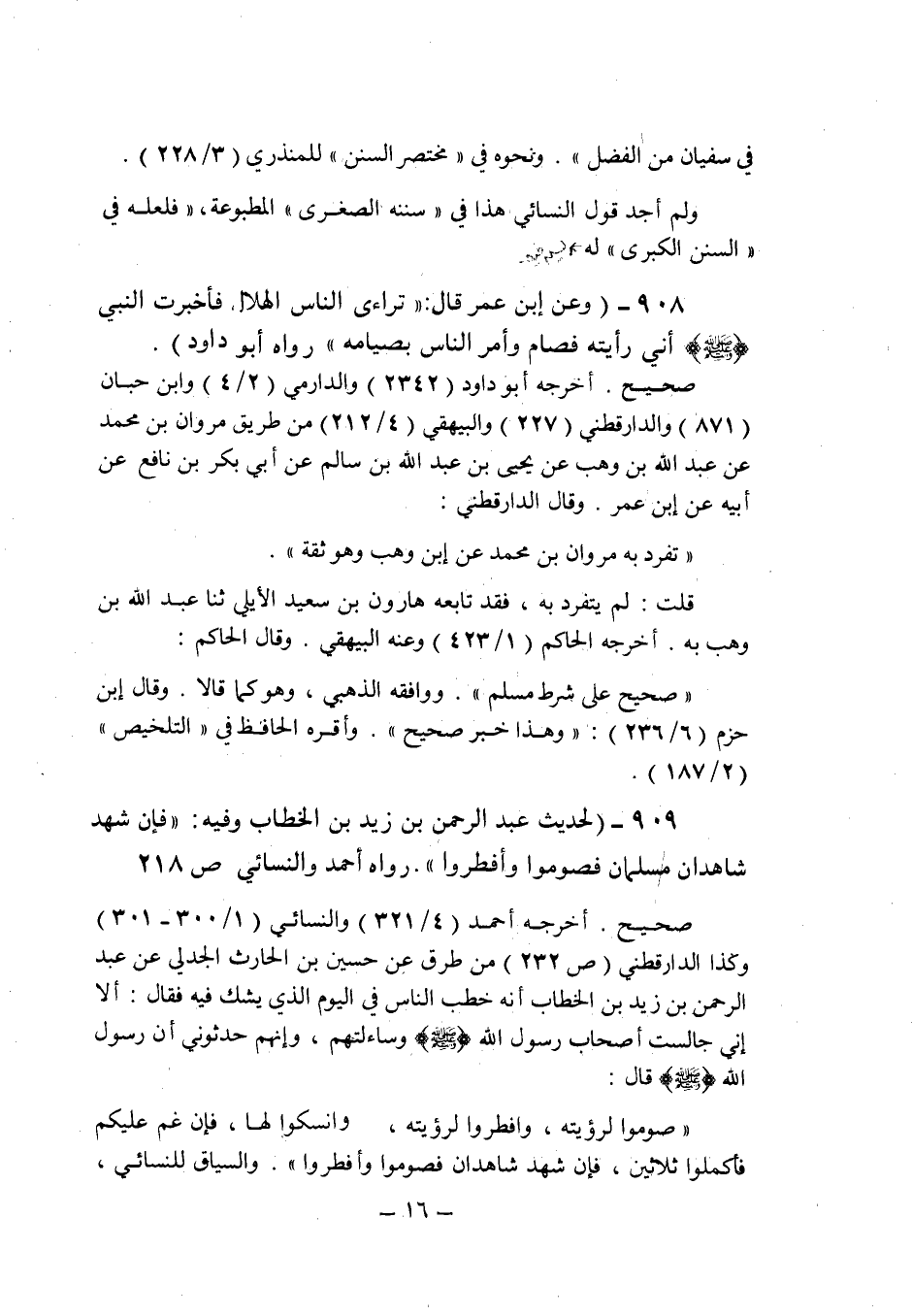(909) - (لحديث عبد الرحمن بن زيد بن الخطاب وفيه: " فإن شهد شاهدان مسلمان فصوموا وأفطروا " رواه أحمد والنسائى (ص 218) .