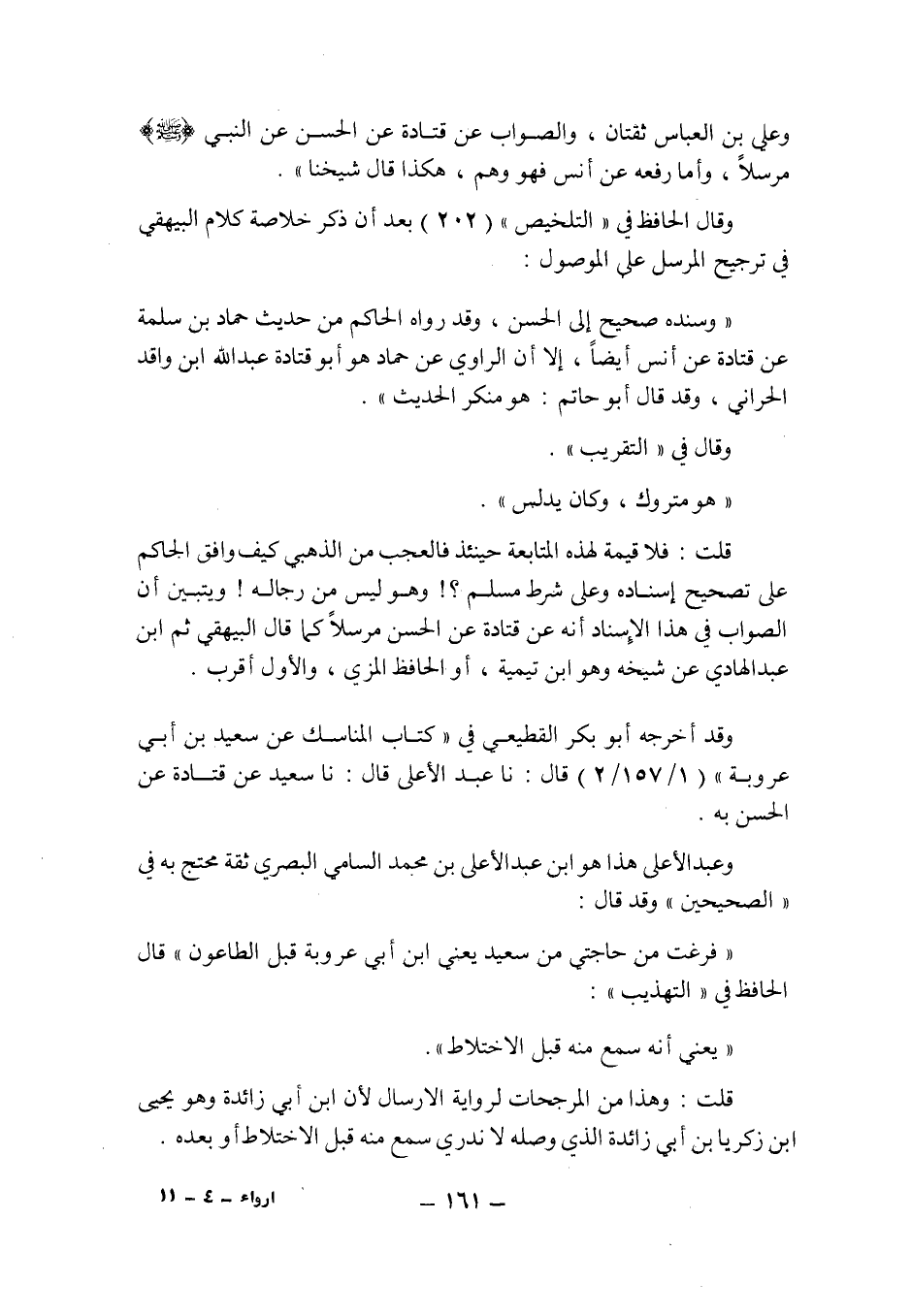 قلت: فلا قيمة لهذه المتابعة حينئذ فالعجب من الذهبى كيف وافق الحاكم على تصحيح إسناده وعلى شرط مسلم؟ ! وهو ليس من رجاله! ويتبين أن الصواب فى هذا الإسناد أنه عن قتادة عن الحسن مرسلاً كما قال البيهقى ثم ابن عبد الهادى عن شيخه وهو ابن تيمية , أو الحافظ المزى , والأول أقرب.