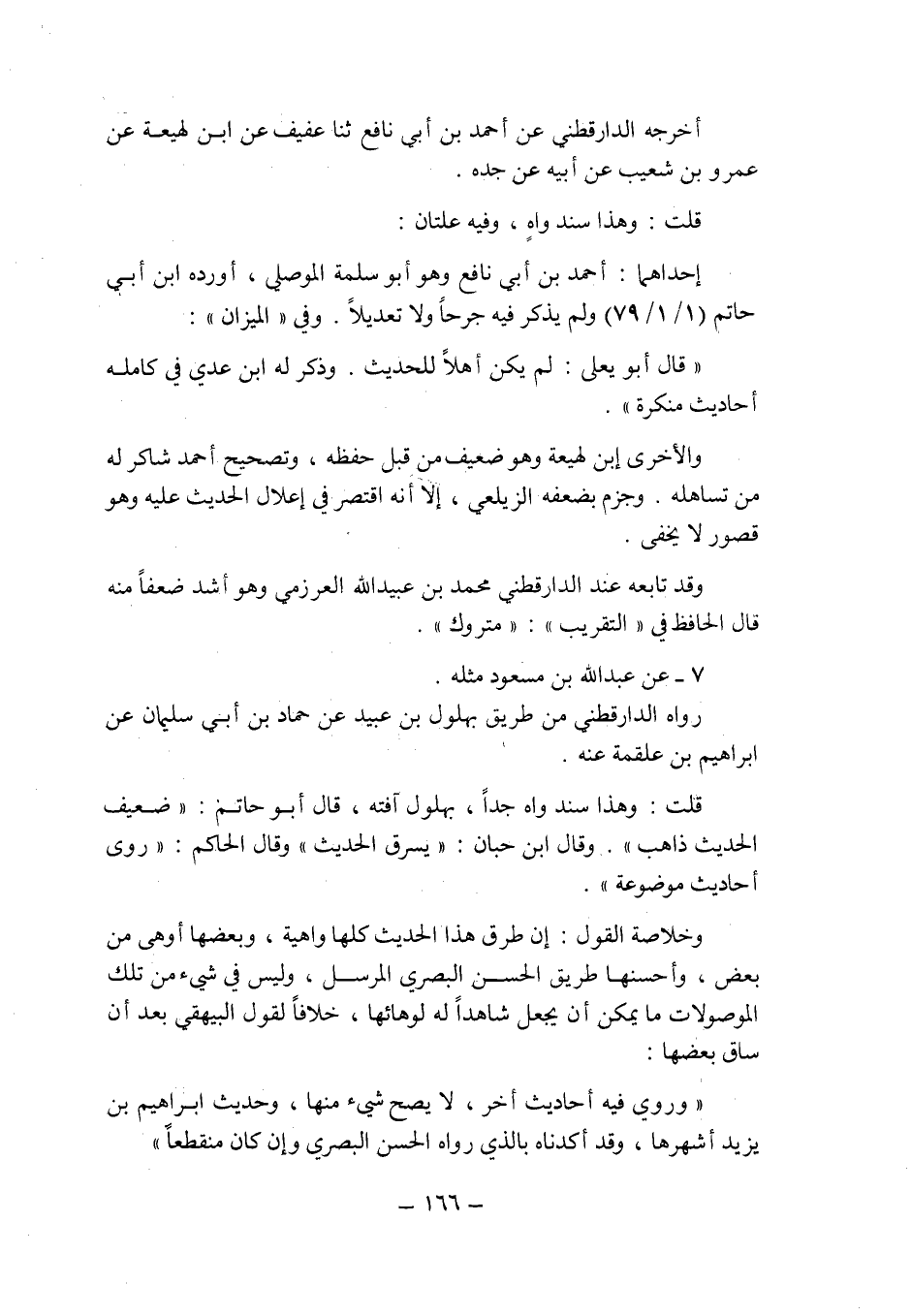 والأخرى: ابن لهيعة وهو ضعيف من قبل حفظه , وتصحيح أحمد شاكر له من تساهله. وجزم بضعفه الزيلعى , إلا أنه اقتصر فى إعلال الحديث عليه وهو قصور لا يخفى وقد تابعه عند الدارقطنى محمد بن عبيد الله العرزمى وهو أشد ضعفا منه قال الحافظ فى " التقريب ": " متروك ".