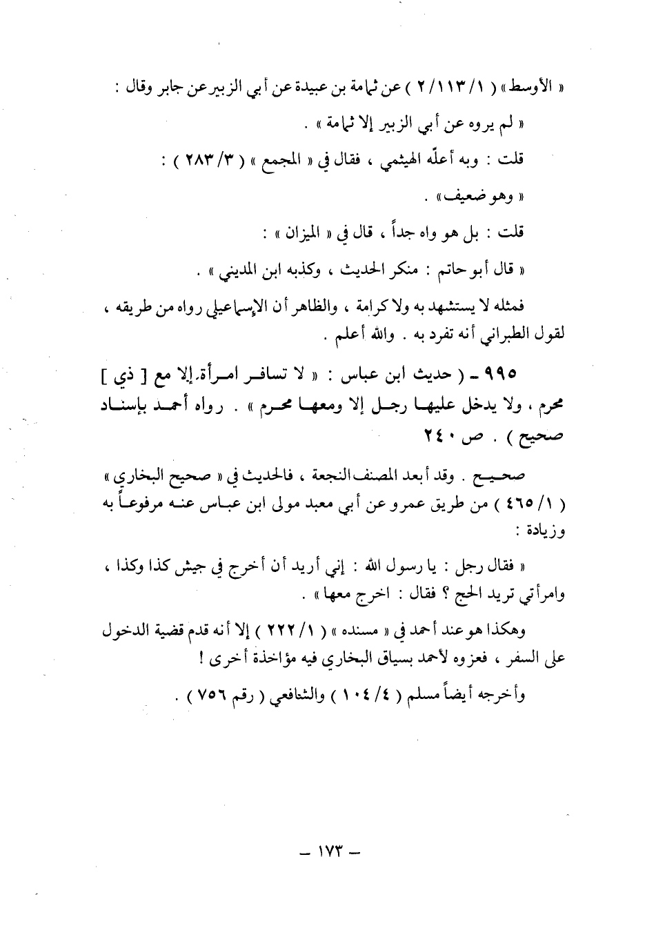 (995) - (حديث ابن عباس: " لا تسافر امرأة إلا مع [ذى] محرم , ولا يدخل عليها رجل إلا ومعها محرم " رواه أحمد بإسناد صحيح (ص 240) .