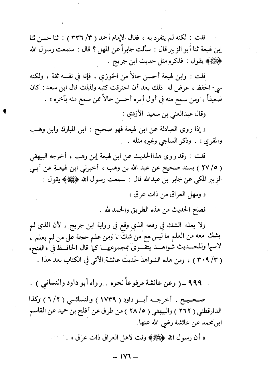قلت: وقد روى هذا الحديث عن ابن لهيعة ابن وهب , أخرجه البيهقى (5/27) بسند صحيح عن عبد الله بن وهب , أخبرنى ابن لهيعة عن أبى الزبير المكى عن جابر بن عبد الله قال: سمعت رسول الله صلى الله عليه وسلم يقول: " ومهل العراق من ذات عرق ".