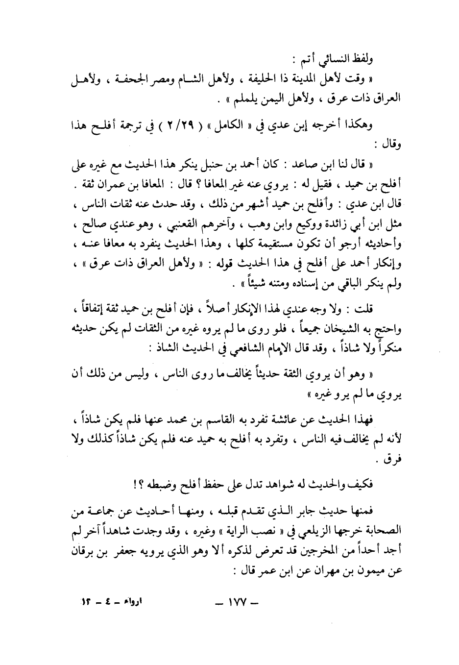 قال ابن عدى: وأفلح بن حميد أشهر من ذلك , وقد حدث عنه ثقات الناس , مثل ابن أبى زائدة ووكيع وابن وهب , وآخرهم القعنبى , وهو عندى صالح , وأحاديثه أرجو أن تكون مستقيمة كلها , وهذا الحديث ينفرد به معافى عنه , وإنكار أرجو أن تكون مستقيمة كلها , وهذا الحديث ينفرد به معافا عنه , وإنكار أحمد على أفلح فى هذا الحديث قوله: " ولأهل العراق ذات عرق " , ولم ينكر الباقى من إسناده ومتنه شيئا ".