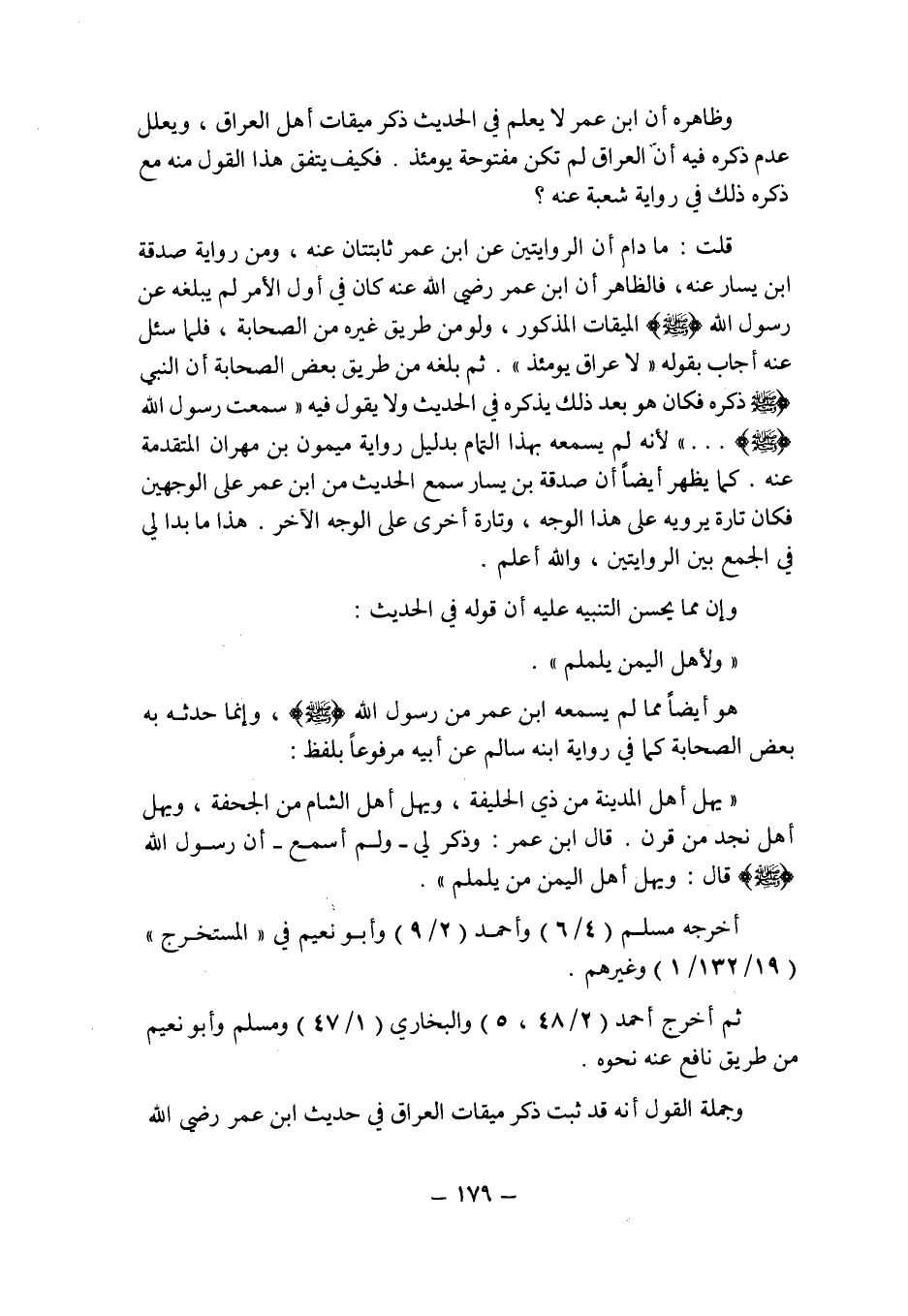 قلت: ما دام أن الروايتين عن ابن عمر ثابتتان عنه , ومن رواية صدقة ابن يسار عنه , فالظاهر أن ابن عمر رضى الله عنه كان فى أول الأمر لم يبلغه عن رسول الله صلى الله عليه وسلم الميقات المذكور , ولو من طريق غيره من الصحابة , فلما سئل عنه أجاب بقوله " لا عراق يومئذ ".