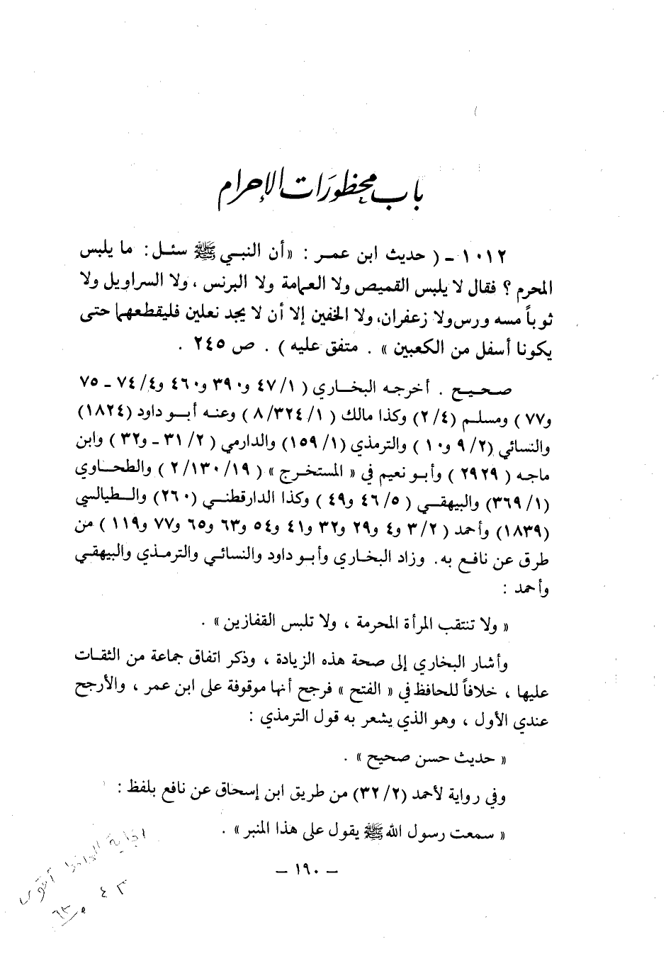 (1012) - (حديث ابن عمر: " أن النبي صلى الله عليه وسلم سئل: ما يلبس المحرم؟ فقال: لا يلبس القميص ولا العمامة ولا البرنس , ولا السراويل ولا ثوبا مسه ورس ولا زعفران , ولا الخفين إلا ألا يجد نعلين فليقطعهما حتى يكونا أسفل من الكعبين ". متفق عليه) . ص 245.