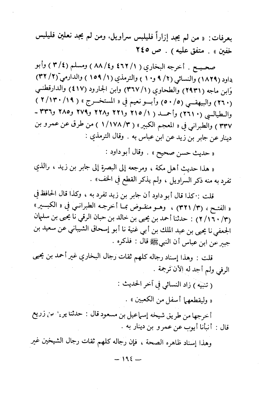 أخرجه البخاري (1/462 و4/88) ومسلم (4/3) وأبو داود (1829) والنسائي (2/9 و10) والترمذي (1/159) والدارمي (2/32) وابن ماجه (2931) والطحاوي (1/367) وابن الجارود (417) والدارقطني (260) والبيهقي (5/50) وأبو نعيم في " المستخرج " (19/130/2) والطيالسي (2610) وأحمد (1/215 و221 و228 و279 و285 و336 ـ 337) والطبراني في " المعجم الكبير (3/178/1) من طرق عن عمرو بن دينار عن جابر بن زيد عن ابن عباس به , وقال الترمذي: حديث حسن صحيح , وقال أبو داود: هذا حديث أهل مكة , ومرجعه إلى البصرة إلى جابر بن زيد , والذي تفرد منه ذكر السراويل , ولم يذكر القطع في الخف.